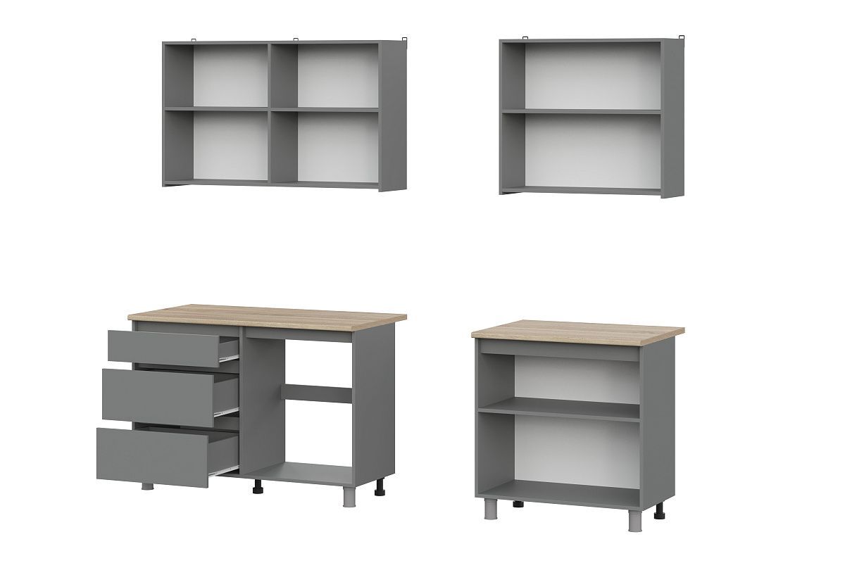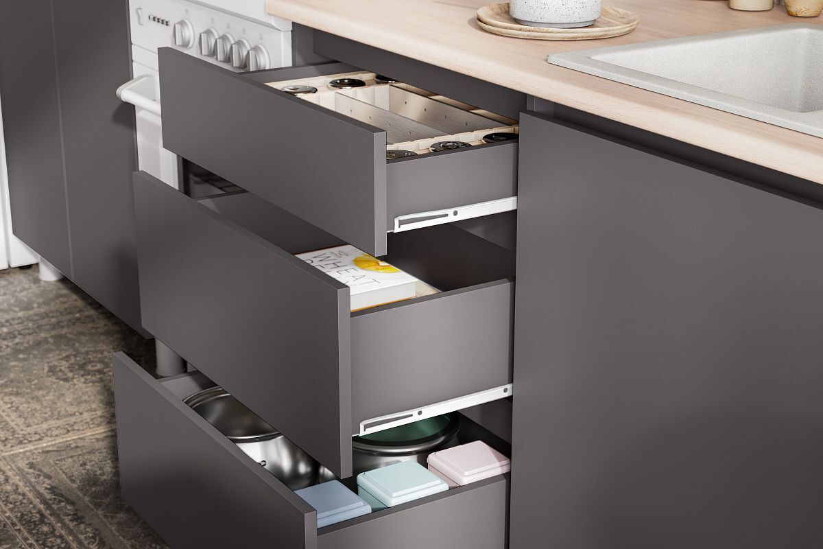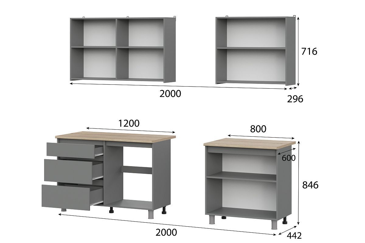 Гарнитур включает в себя ящики и полки, что позволяет максимально эффективно использовать пространство и удобно хранить все необходимые кухонные принадлежности.