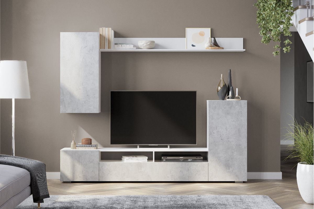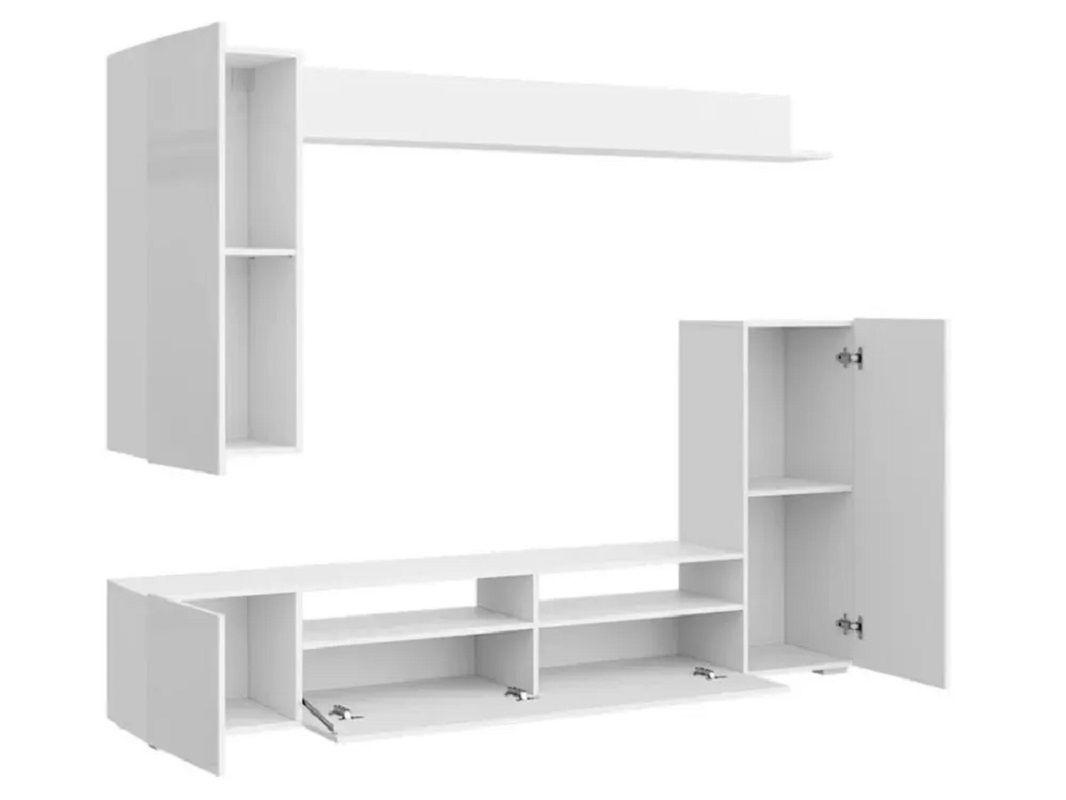 Корпус/Фасад: ЛДСП «Белый глянец»Ручки: Ручки отсутствуют. Створки открываются за выступающие торцы.Опоры: Регулируемые Н-20 пластик. (Без присадки под крепеж).Направляющие ящиков: Ящиками не комплектуется.Петли створок: Стандарт. (Без доводчиков).Комплект состоит из тумбы, навесного пенала и навесной полки. Габариты комплекта ШхВхГ 2130х1700х346 мм. В таком виде как на изображении размеры ниши под ТВ составляют 1244х1178 мм. Изделие можно собрать зеркально.1) Тумба. (ШхВхГ) 2131х942х346 мм.Элемент представляет собой тумбу с пеналом. Имеет 3 отсека для хранения и открытые ниши. Отсеки для хранения комплектуются распашными створками, отсек под открытыми нишами комплектуется откидной створкой без газлифтов. В пенале устанавливается съемная полка. Тумба собирается на любую сторону2) Навесной пенал. (ШхВхГ) 434х922х346 мм.Пенал комплектуется универсальной распашной створкой, которая может навешиваться на любую боковину. Внутри пенала устанавливается съемная полка. Элемент крепится к стене на монтажные планки при помощи регулируемых кухонных навесов. Разметка для установки навесов, а также вырезы в задней стенке под них делаются во время сборки самостоятельно согласно инструкции. Крепеж в стену подбирается покупателем самостоятельно, исходя из материала стен.3)Полка навесная. (ШхГ) 1697х166х182 мм.Полка представляет собой две детали из ЛДСП «Белый» скрепленные под прямым углом евровинтами. Полка навешивается на стену при помощи врезных регулируемых навесов «Hafele». Крепеж в стену подбирается покупателем самостоятельно, исходя из материала стен. Максимально допустимая нагрузка - 5 кг.