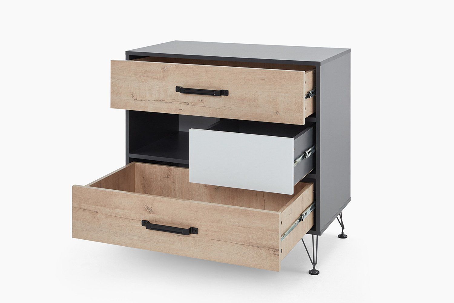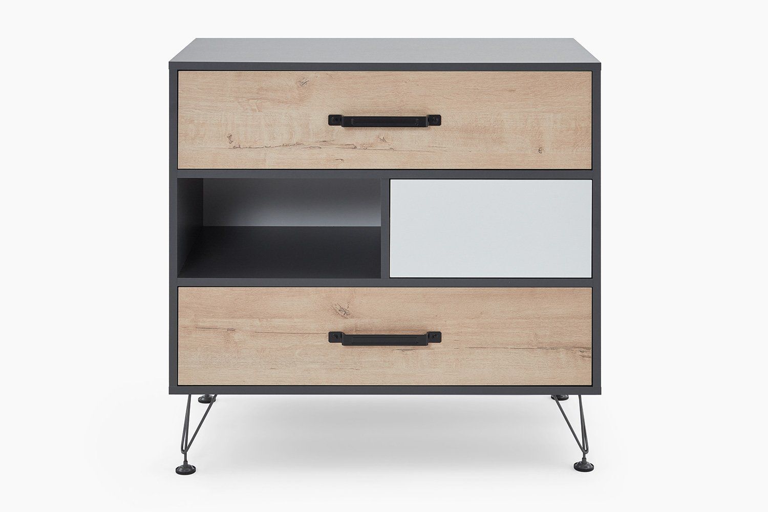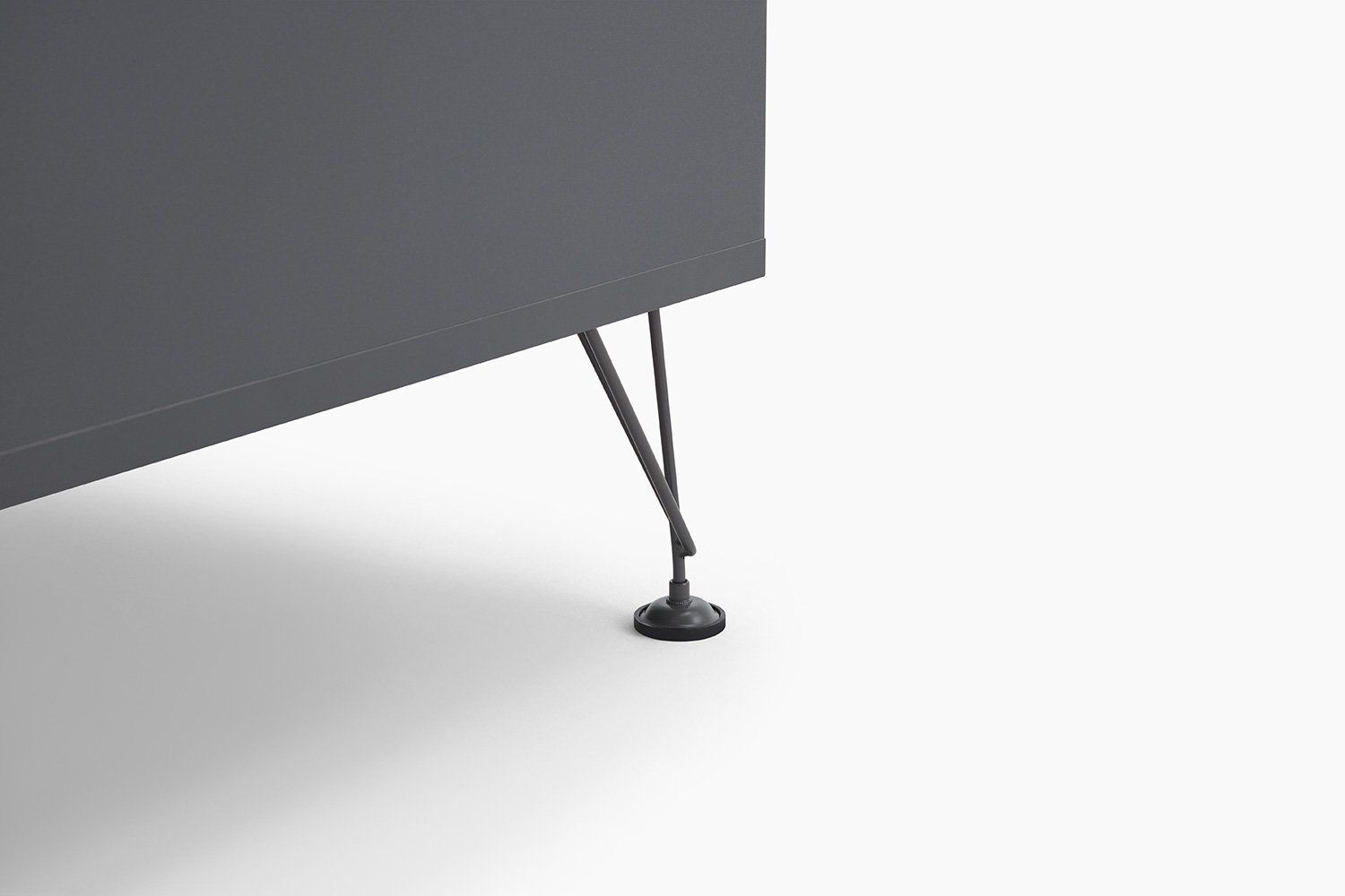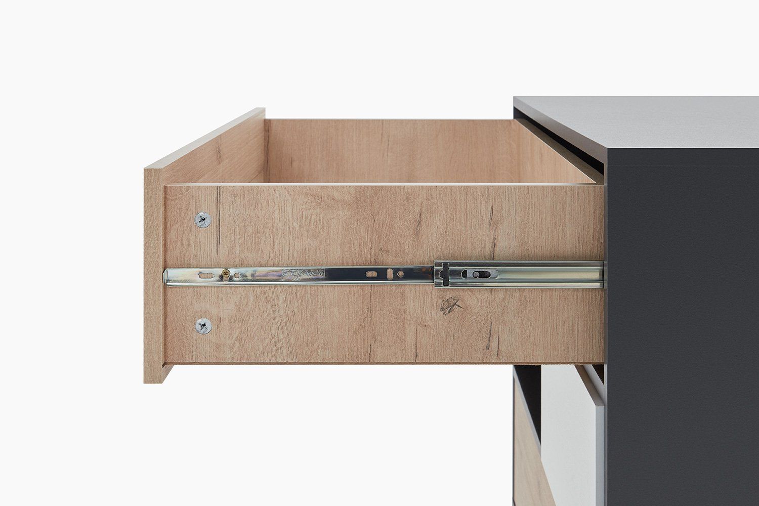 Он имеет три выдвижных ящика, где поместится большой объем личных вещей. Так же есть маленькая ниша, которая создает эффект открытости. Ящики имеют шариковые направляющие, а для белого отсека применена система Push-to-open (открывается нажатием).Опорами служат регулируемые металлические ножки, которые придают невесомость изделию. Ручки выполнены из металла и надежно закреплены винтами.