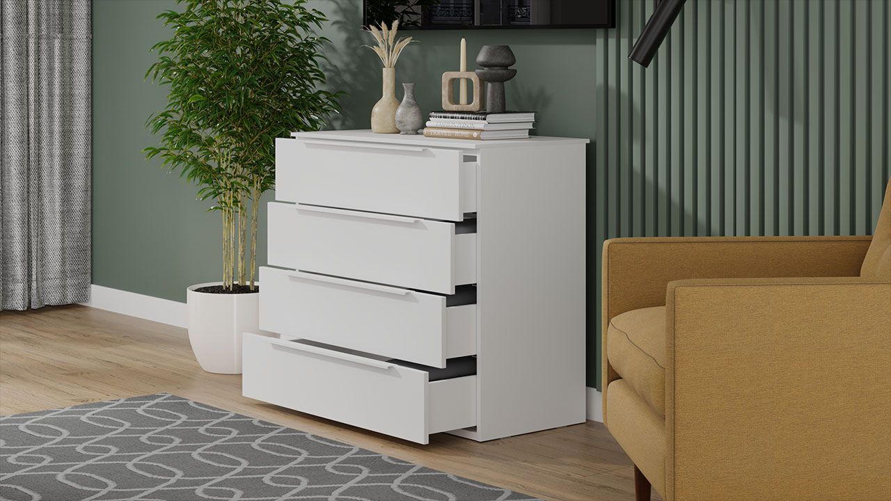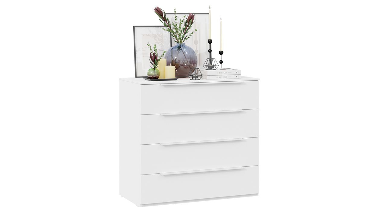 Особенностью комода являются 4 выдвижных ящика с направляющими скрытого монтажа. Это обеспечивает плавное и бесшумное открывание ящиков, а также позволяет экономить пространство. Максимальная нагрузка на комод составляет 30 кг.