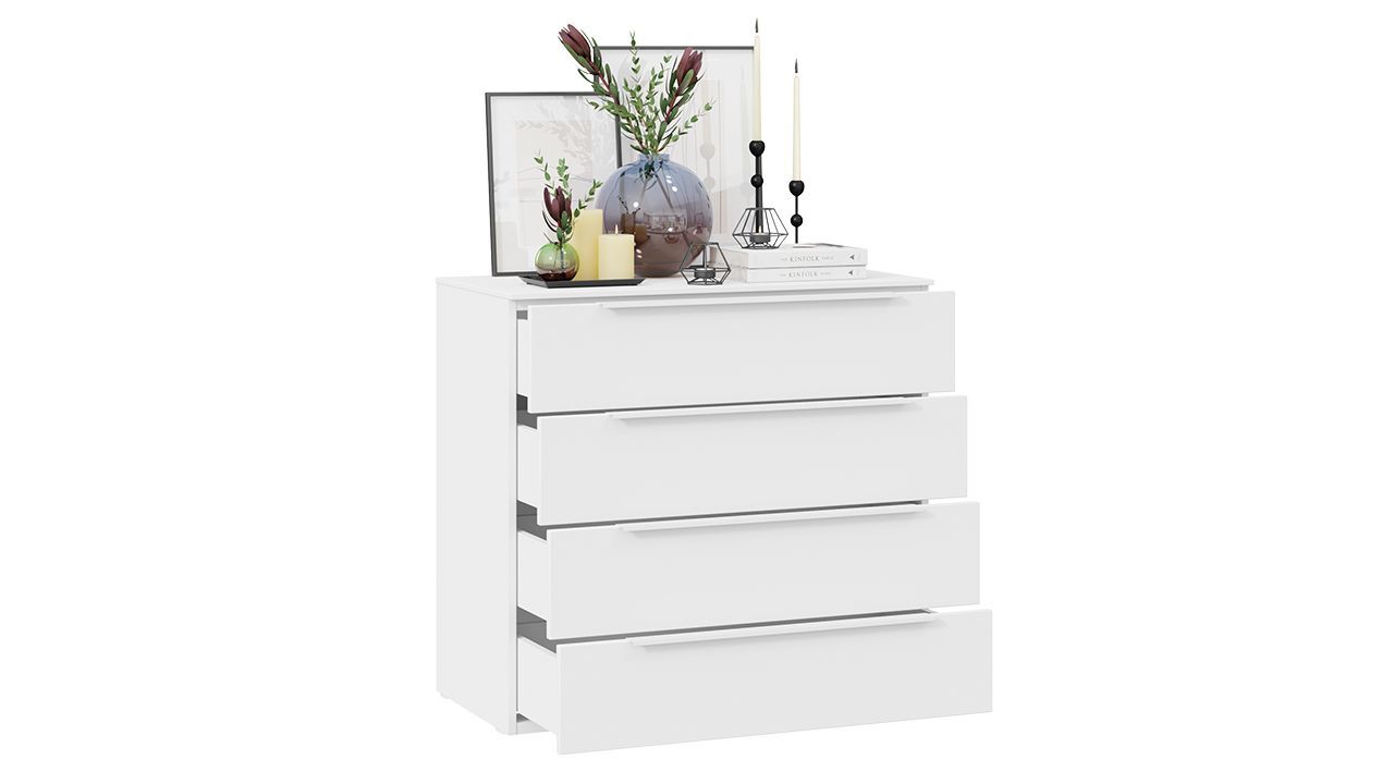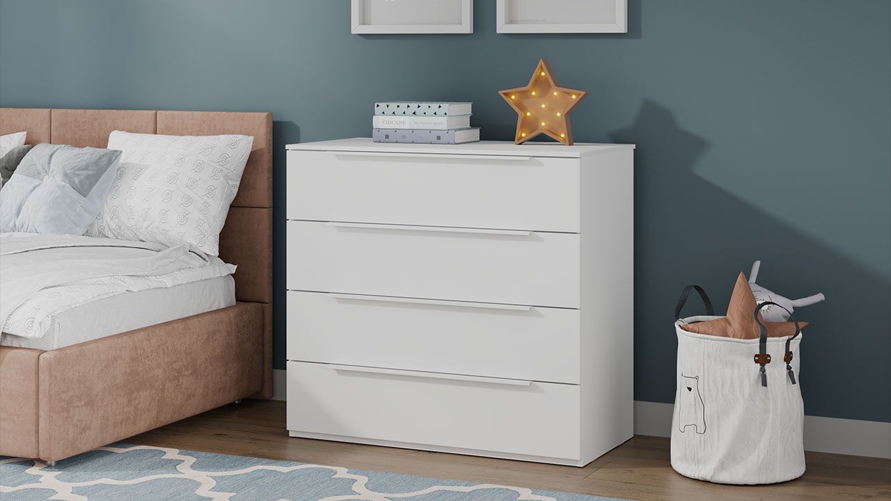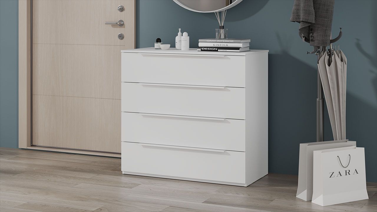 Комод оснащен четырьмя выдвижными ящиками с направляющими скрытого монтажа. Это обеспечивает плавное и бесшумное открывание ящиков, а также предотвращает случайное выпадение вещей. Максимальная нагрузка на каждый ящик составляет 30 кг.