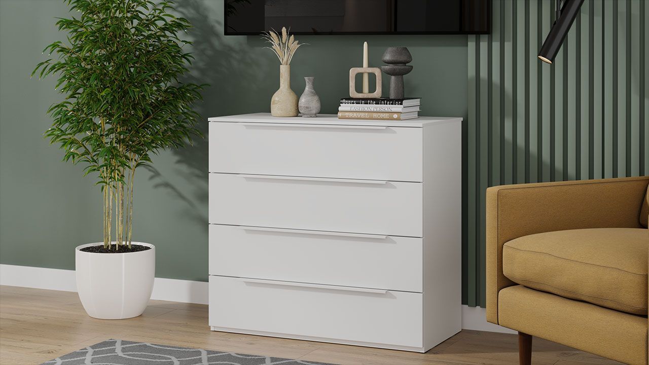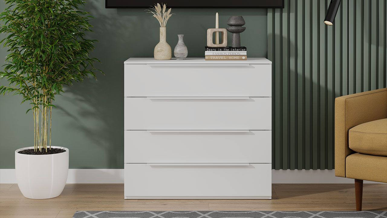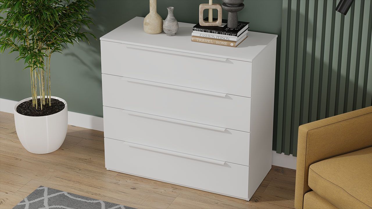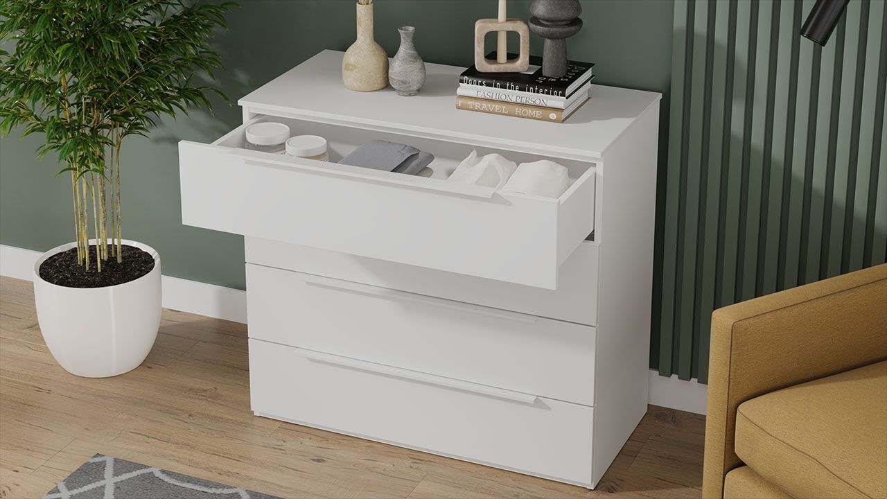 Комод оснащен четырьмя выдвижными ящиками с направляющими скрытого монтажа. Это обеспечивает плавное и бесшумное открывание ящиков, а также предотвращает случайное выпадение вещей. Максимальная нагрузка на каждый ящик составляет 30 кг.