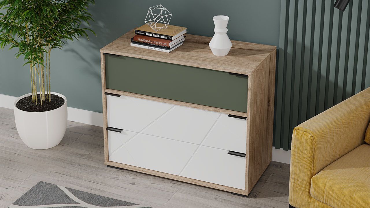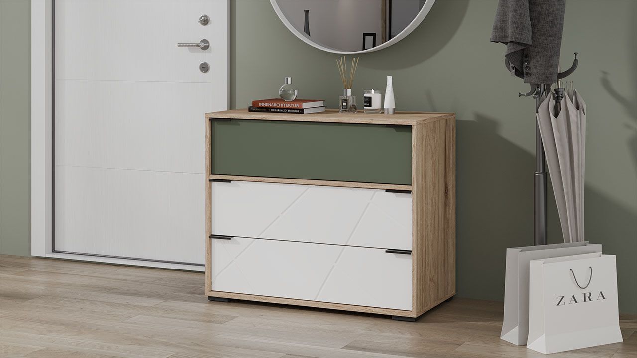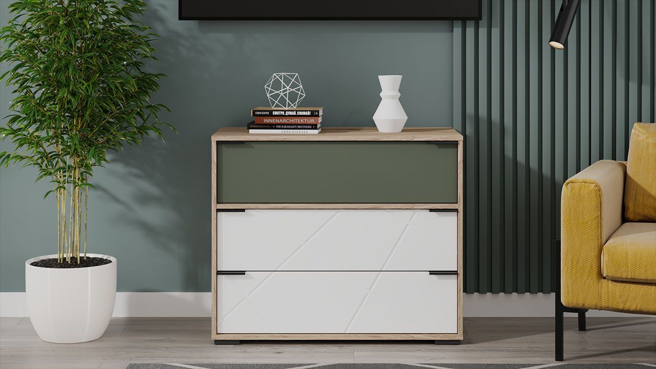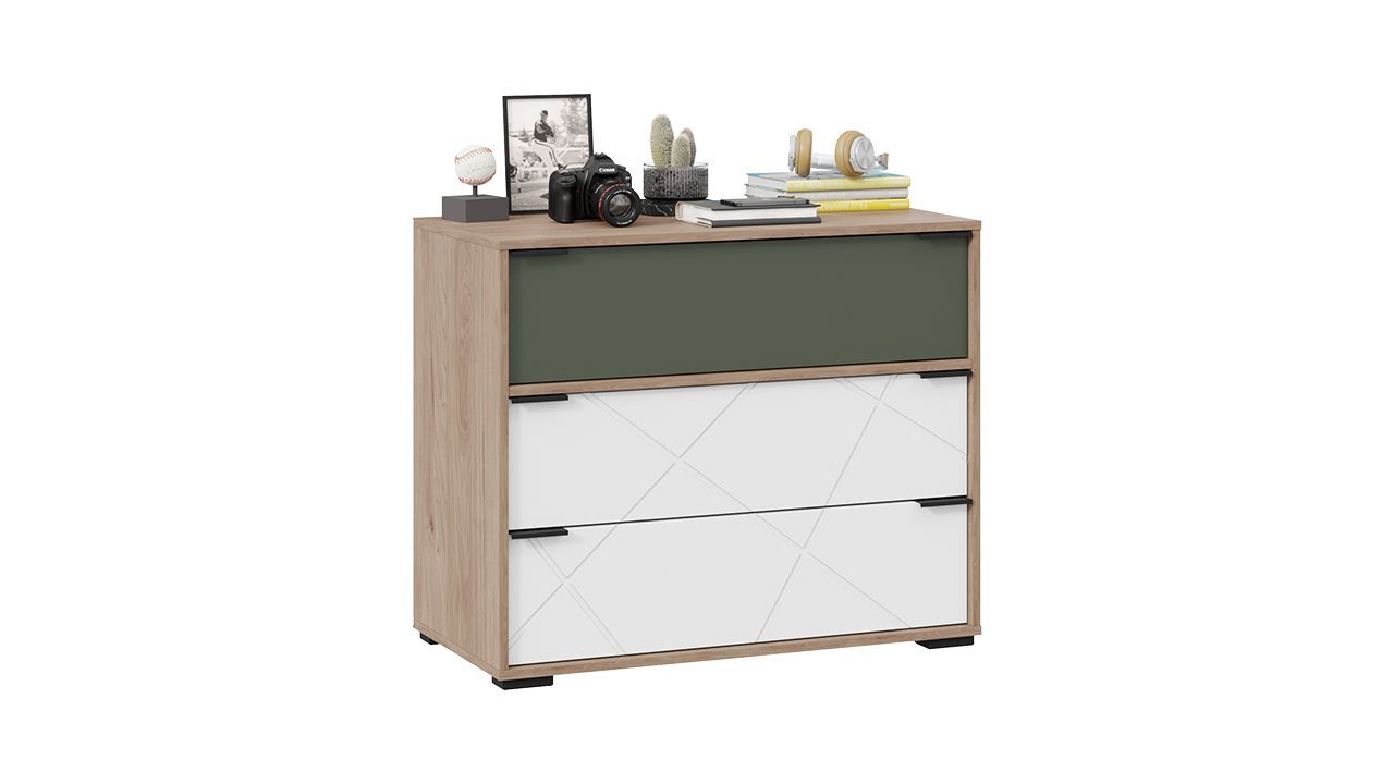 Комод для одежды с ящиками "Гикори джексон/Белый матовый/Дымчатый зеленый" - это стильный и функциональный элемент интерьера, который станет незаменимым помощником в организации хранения одежды, аксессуаров и других предметов.