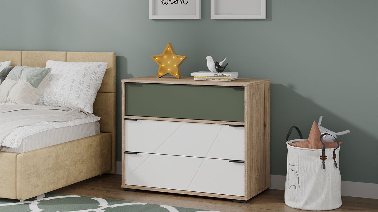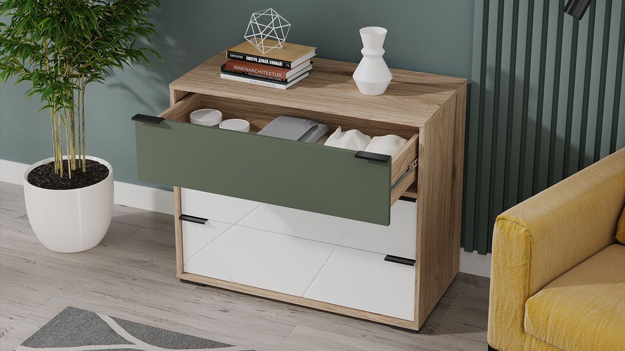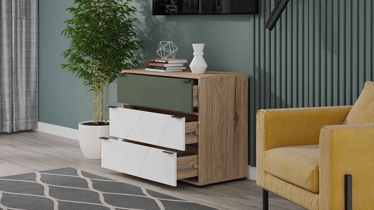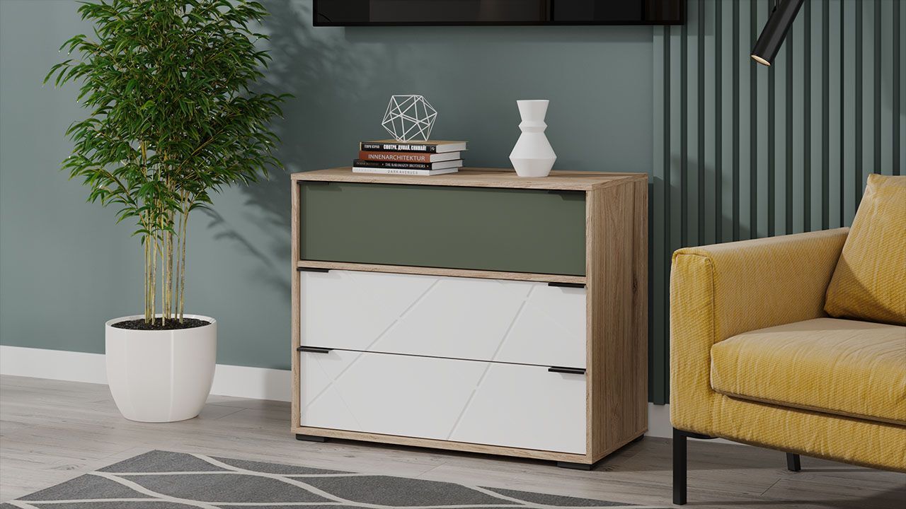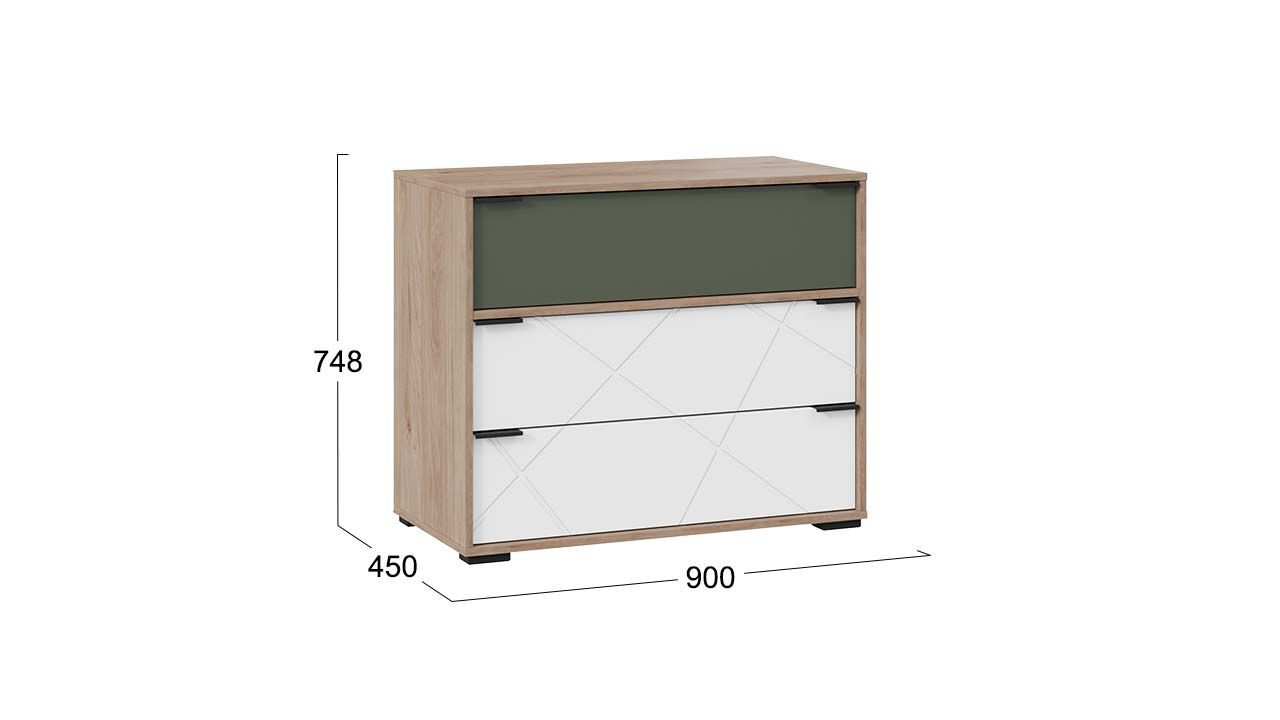 Комод для одежды с ящиками "Гикори джексон/Белый матовый/Дымчатый зеленый" - это стильный и функциональный элемент интерьера, который станет незаменимым помощником в организации хранения одежды, аксессуаров и других предметов.