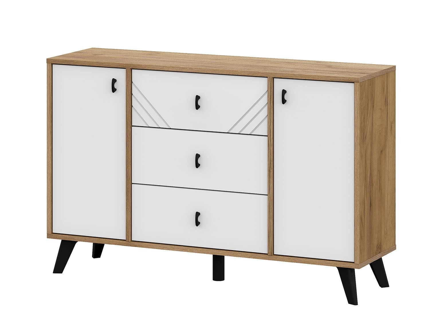 Фасад из МДФ с черными акцентами в виде ручек создает стильный контраст, подчеркивая графичность форм. Центральная часть комода - это три вместительных ящика на шариковых направляющих полного выдвижения. По бокам - секции со створками и внутренними полками, которые отлично подходят для хранения одежды, текстиля или других вещей.