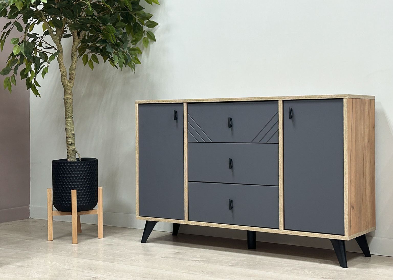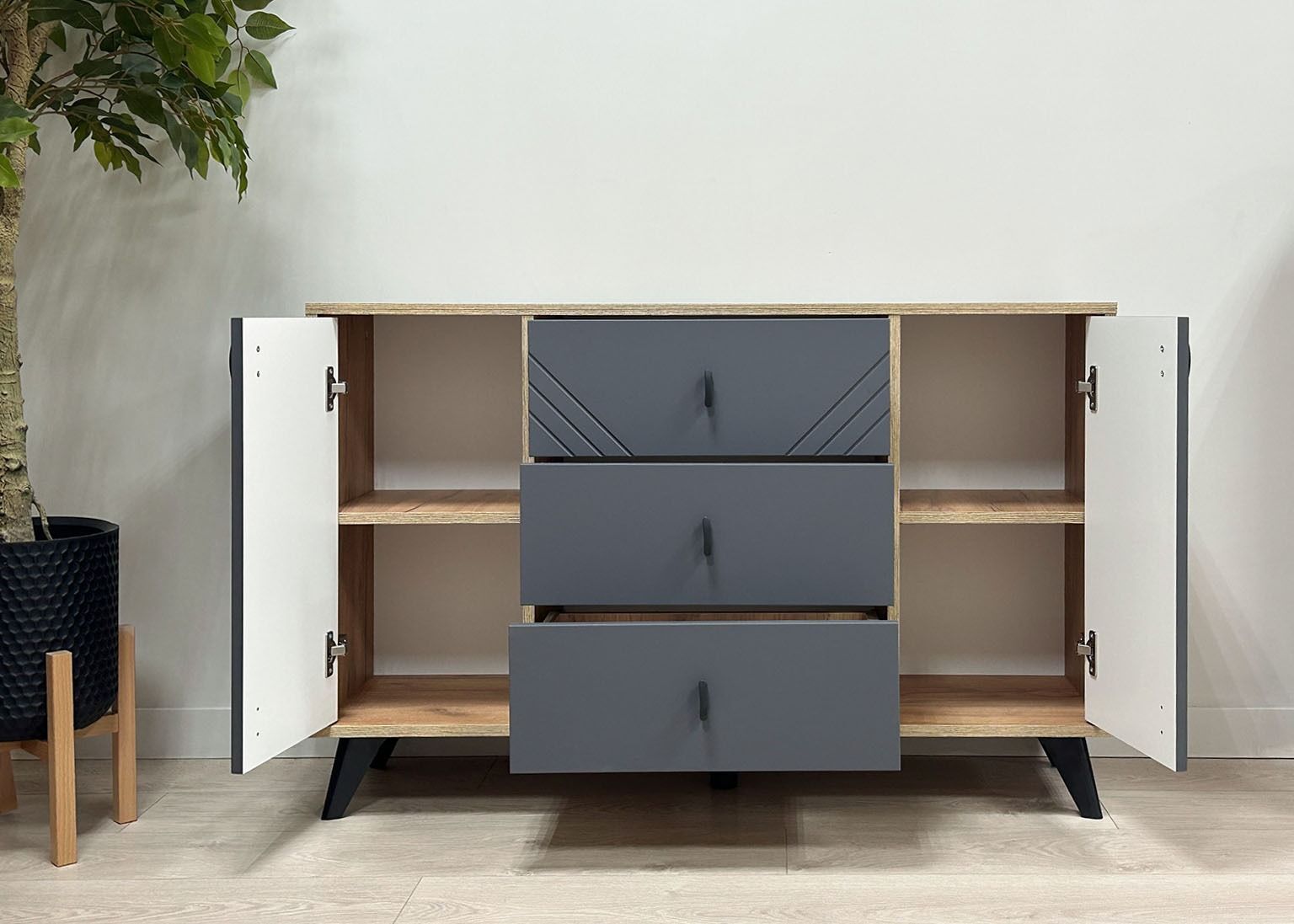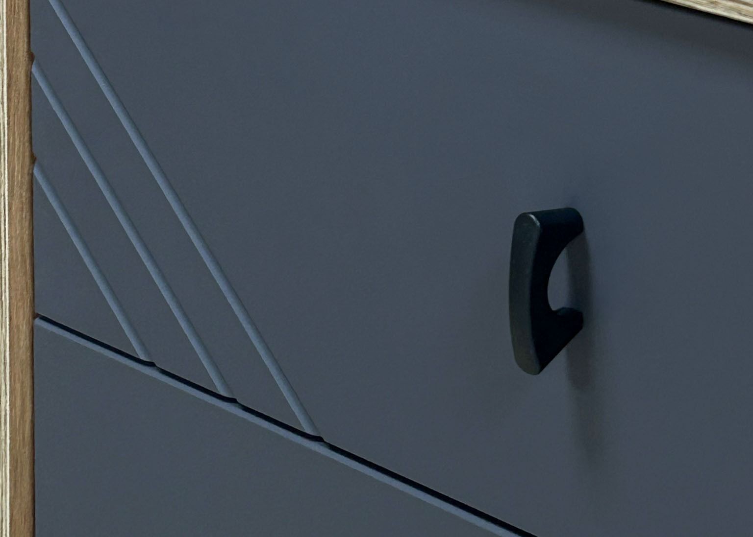 Комод из коллекции «Байкал» — это гармония практичности и выразительного дизайна. Фасад из МДФ с чёрными акцентами в виде ручек создаёт стильный контраст, подчёркивая графичность форм. Центральная часть комода — это три вместительных ящика на шариковых направляющих полного выдвижения. По бокам — секции со створками и внутренними полками, идеально подходящие для хранения одежды, текстиля или других вещей. Комод установлен на высокие ножки, что облегчает уборку, включая использование робота-пылесоса. Лаконичная фрезеровка фасадов, матовая текстура и белый цвет придают модели свежесть и визуальную лёгкость. Отлично сочетается с другими элементами модульной системы «Байкал» — для создания цельного и функционального интерьера.