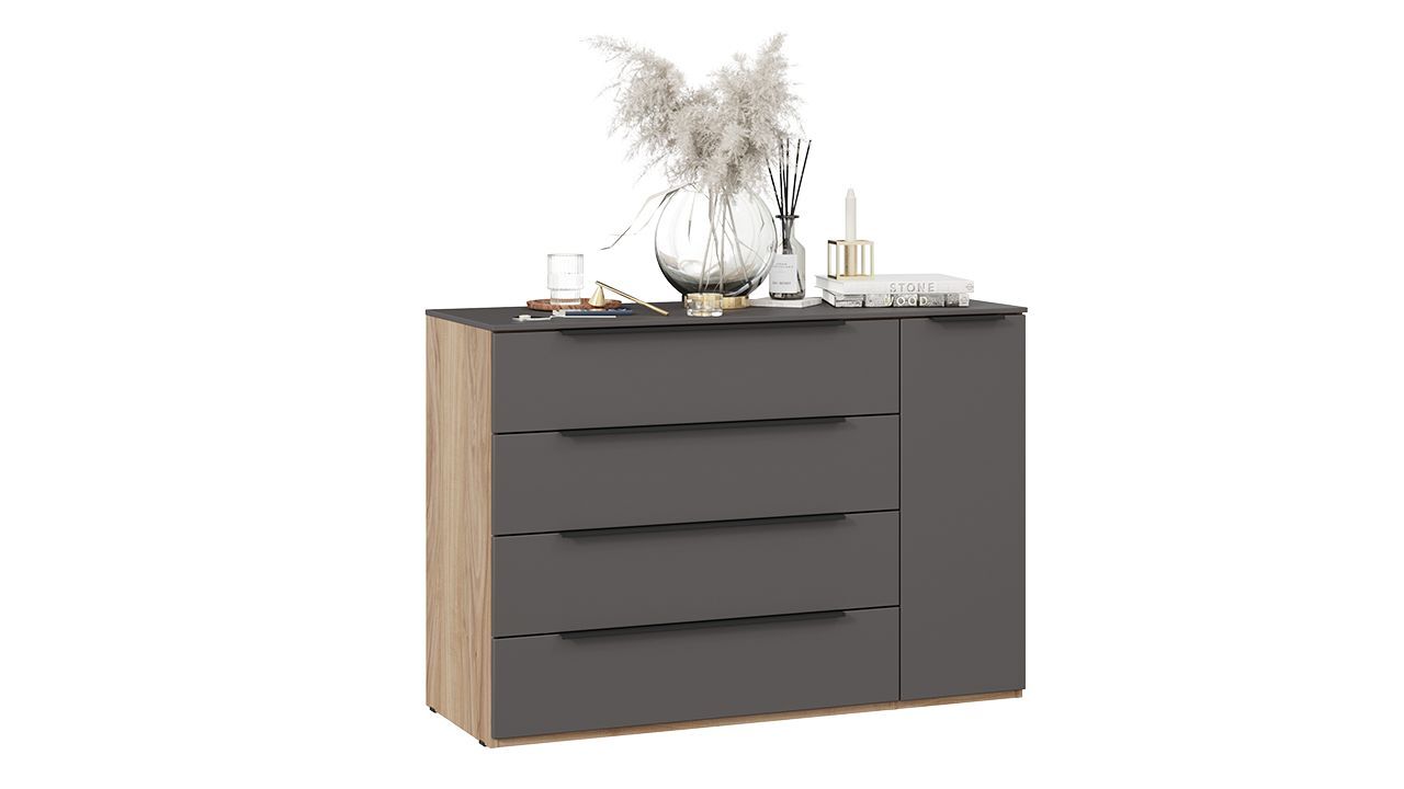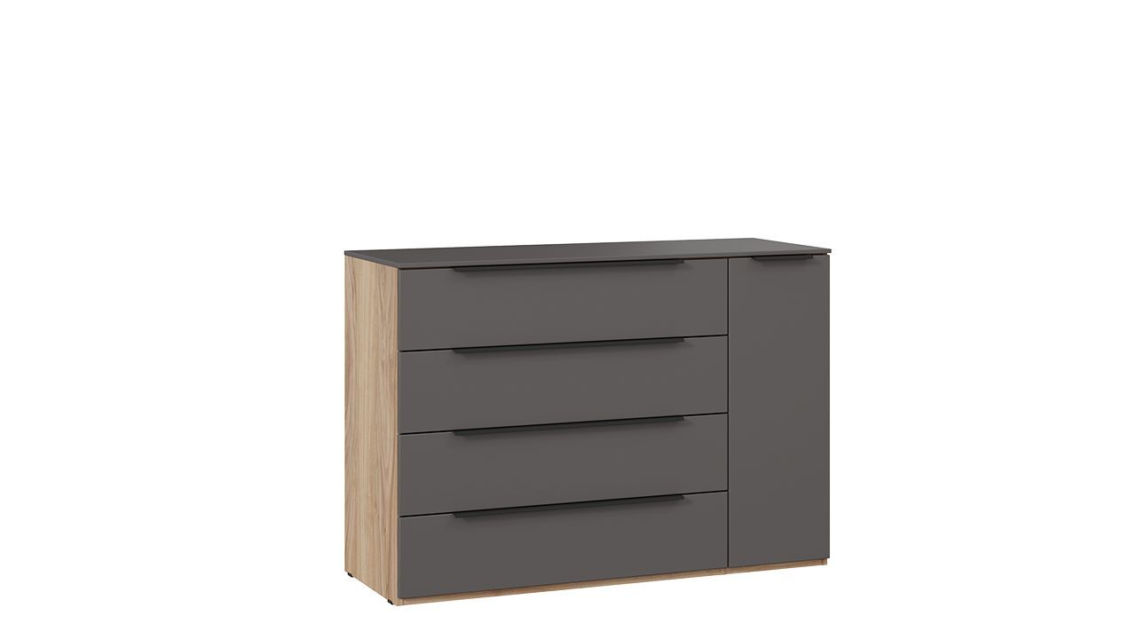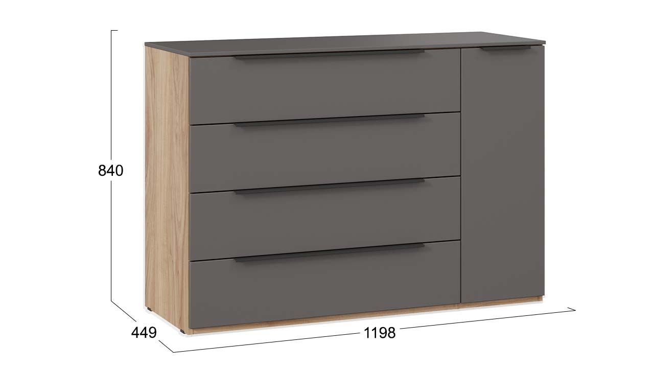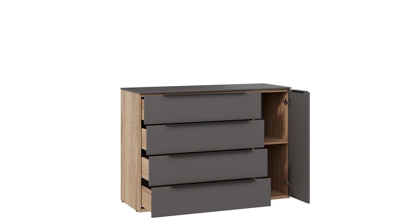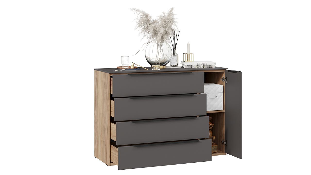 Комод "Яблоня Беллуно/Графит софт" представлен в бежевом и сером цвете, что позволяет гармонично вписать его в любой интерьер.