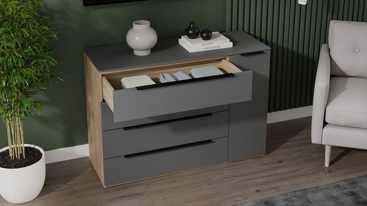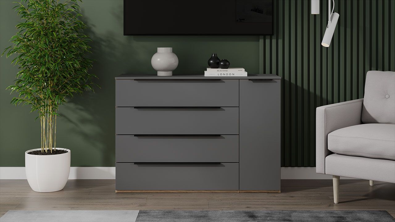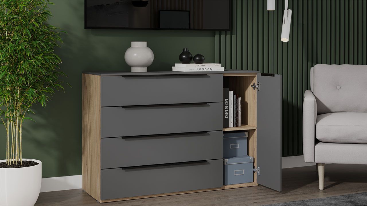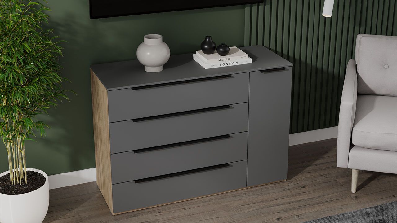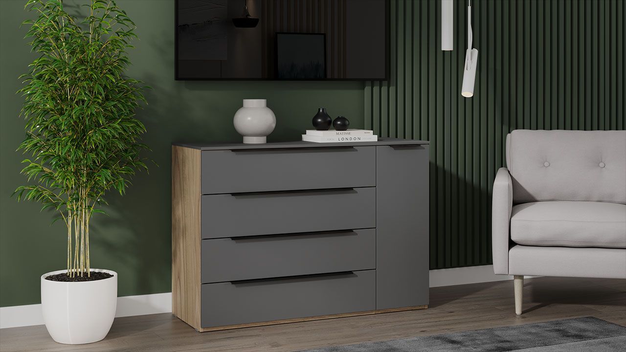 Комод "Яблоня Беллуно/Графит софт" представлен в бежевом и сером цвете, что позволяет гармонично вписать его в любой интерьер.