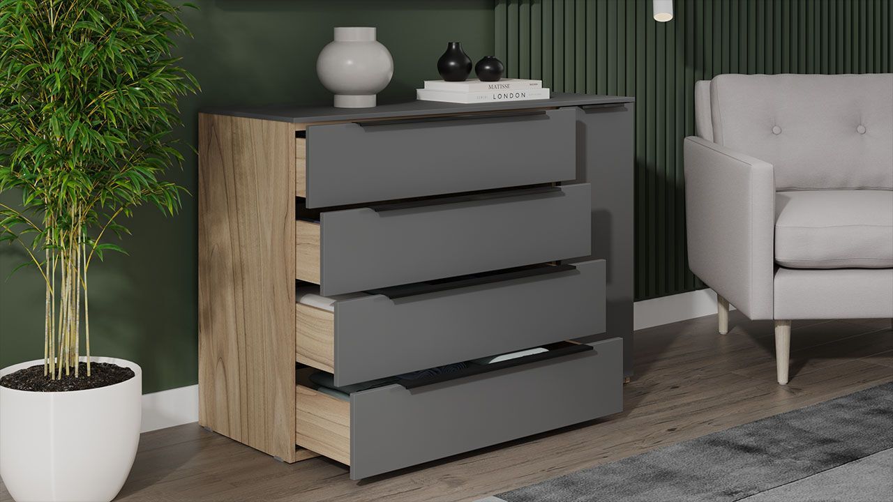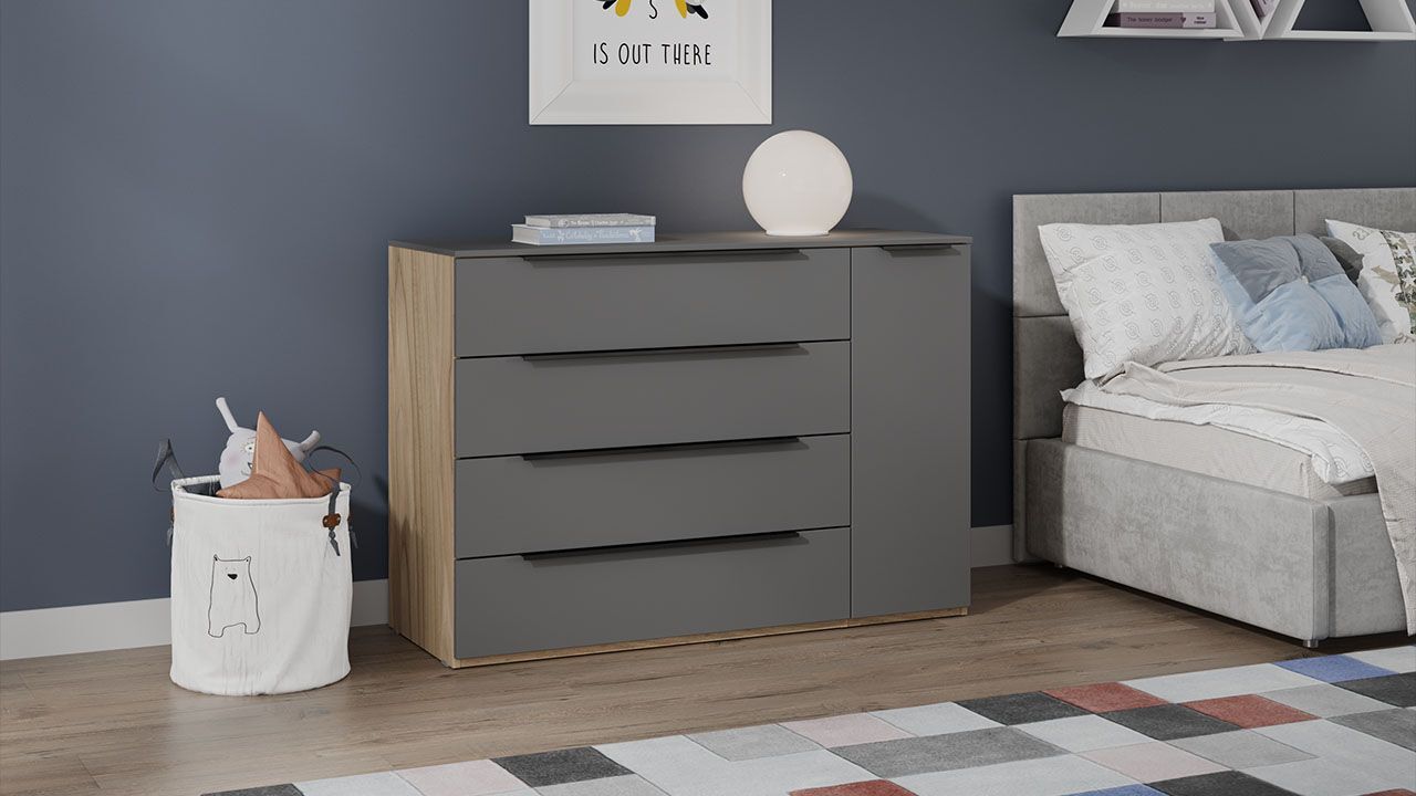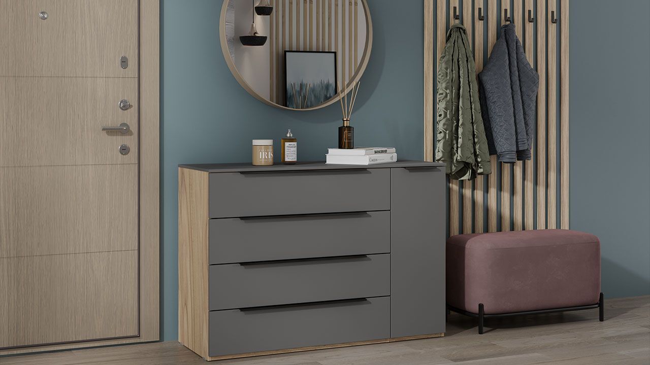 Особенностью комода являются 4 выдвижных ящика и 1 полка, что позволяет удобно организовать пространство и быстро найти нужную вещь. Тип направляющих - скрытого монтажа, что обеспечивает плавное и бесшумное открывание ящиков. Максимальная нагрузка на комод составляет 30 кг.