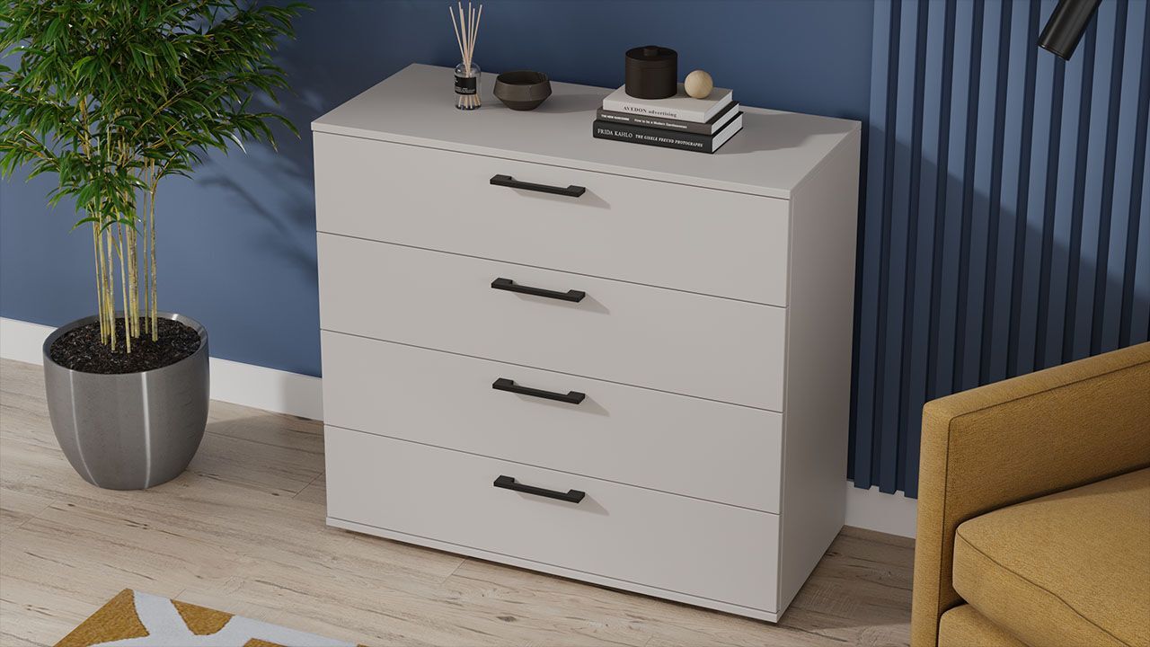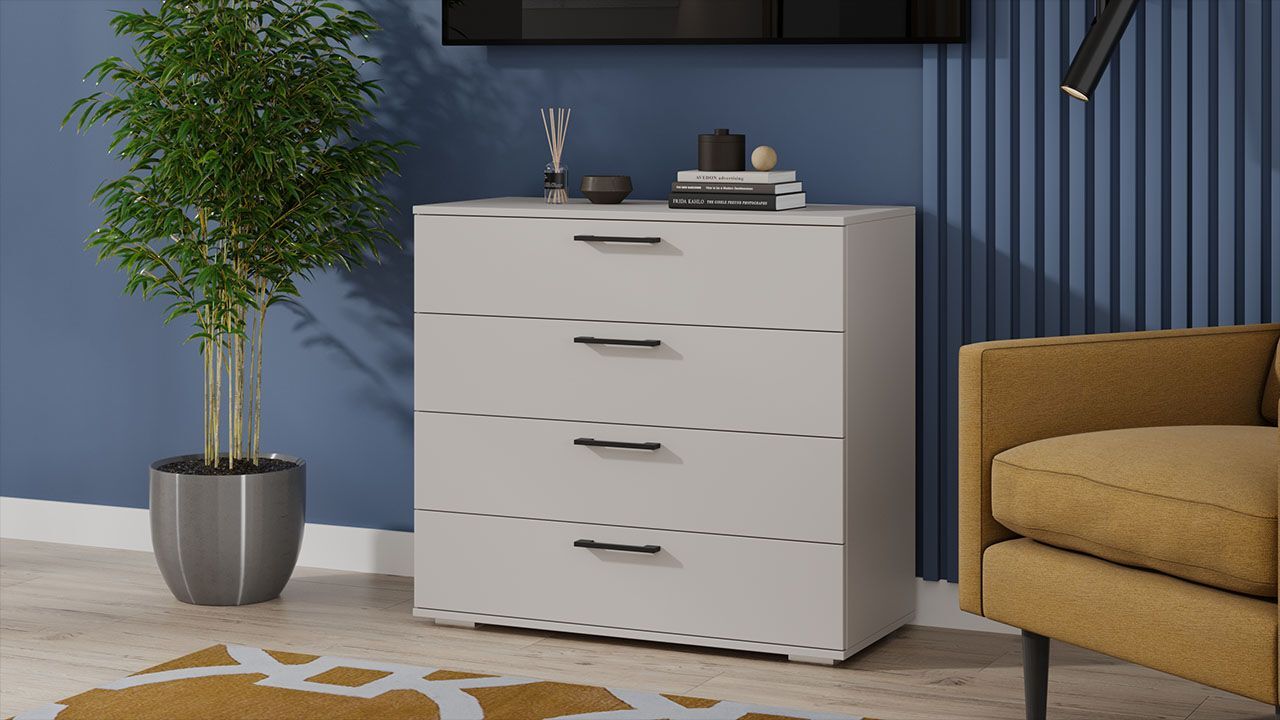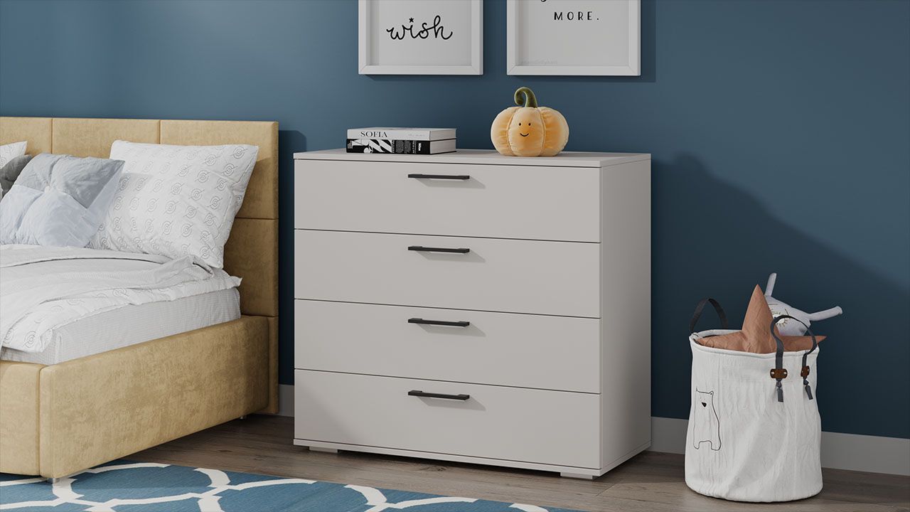 Каркас и фасад комода изготовлены из ЛДСП, что обеспечивает прочность и долговечность изделия. Матовое покрытие корпуса и фасада придает комоду стильный и современный вид.