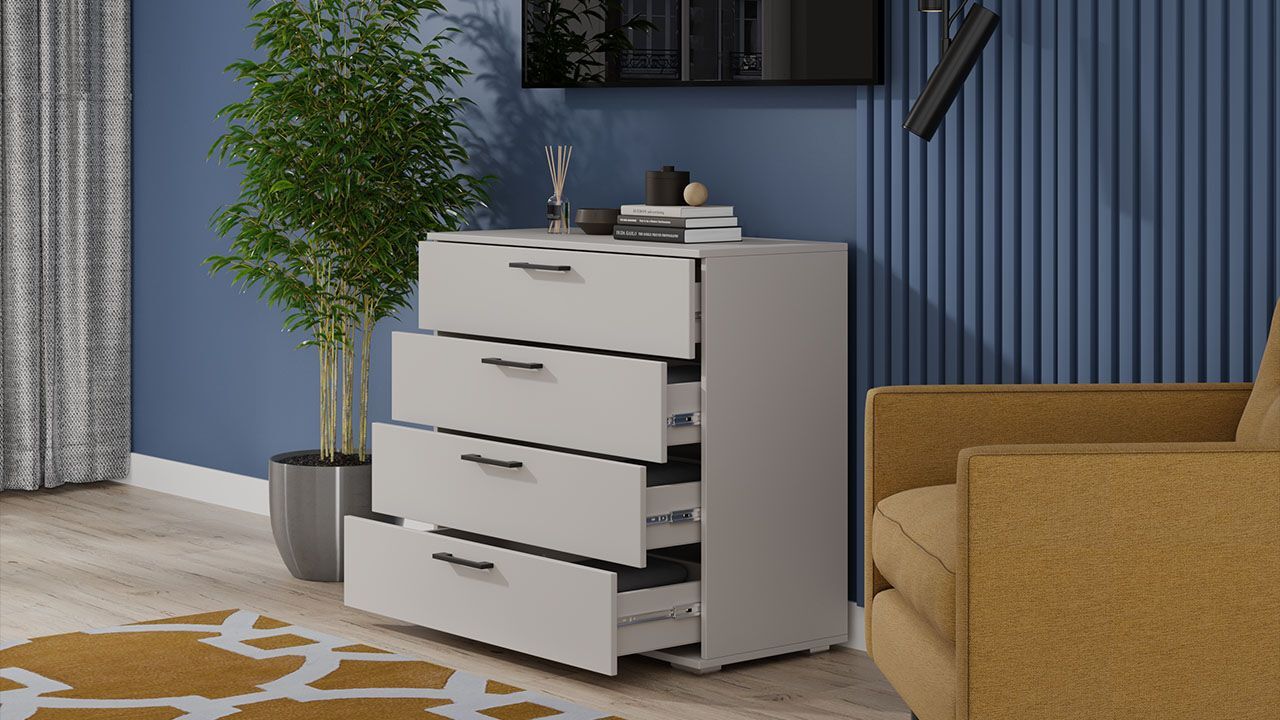 Ящики комода оснащены шариковыми направляющими, обеспечивающими плавное и бесшумное открывание. Максимальная нагрузка на комод составляет 30 кг, что позволяет хранить в нем различные предметы одежды и аксессуары.