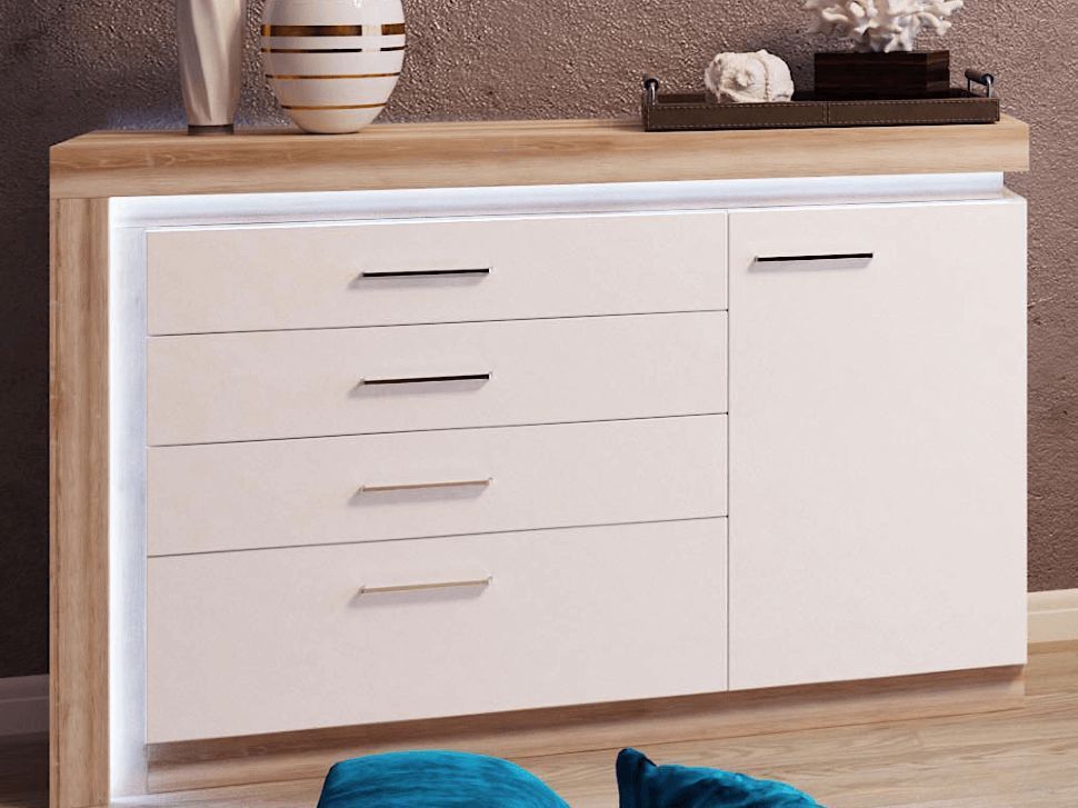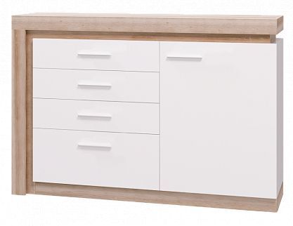 - Корпус выполнен из ЛДСП 16 мм, цвет Дуб Сакраменто. Фасад глянцевый из МДФ 16 мм, цвет Белый снег. Ящики на шариковых направляющих полного выдвижения.