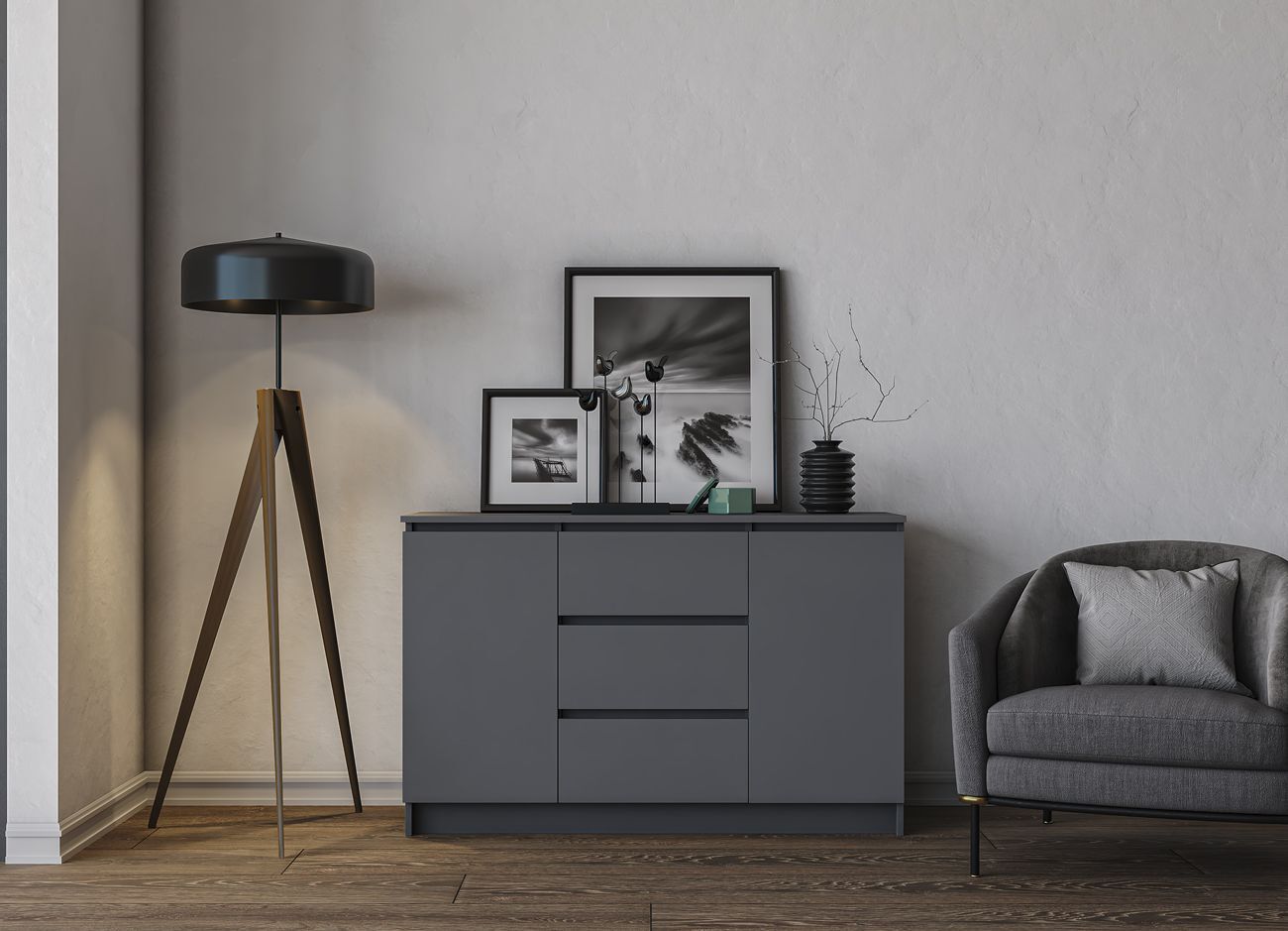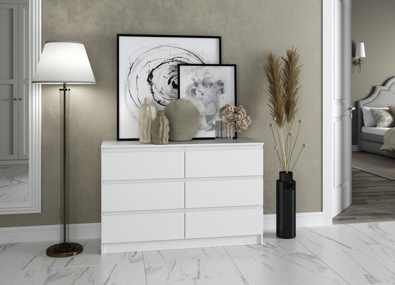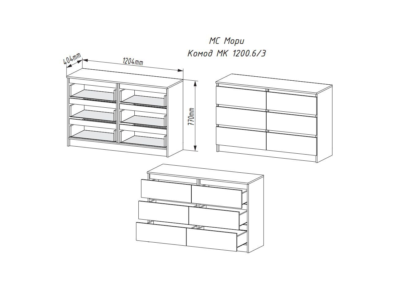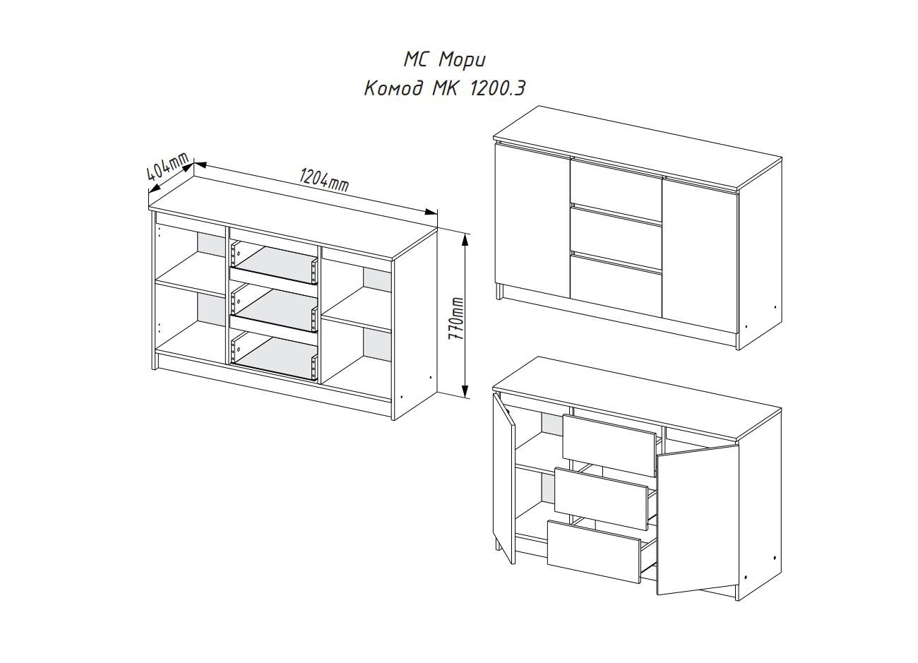 Комод разделен на три секции перегородками, в средней секции расположены три выдвижных ящика на роликовых направляющих. По бокам 2 распашных ящика со съемными полками на полкодержателях, находящиеся за створками. На фасадах отсутствуют ручки, функцию ручек выполняет сам фасад (его верхняя часть с внутренней стороны прямая под углом 90°). Открывание ящиков производится за счет пространства между планками и фасадом. Зона хранения: средних ящиков - 382*344*100 мм. Направляющие роликовые.Комод "Мори" сочетает в себе высокое качество, комфорт и выгодную цену .Идеально впишется в любой интерьер, а также позволит создать современный стиль в вашем доме и прослужит вам долгие годы. Габариты комода: ширина 1204 мм, высота 770 мм, глубина 404 мм. В комплекте с комодом идёт подробная инструкция по сборке, а так же весь необходимый крепёж