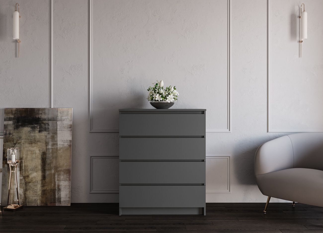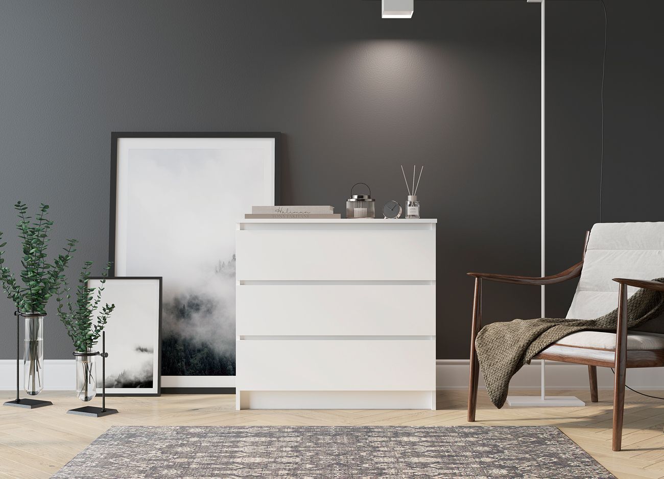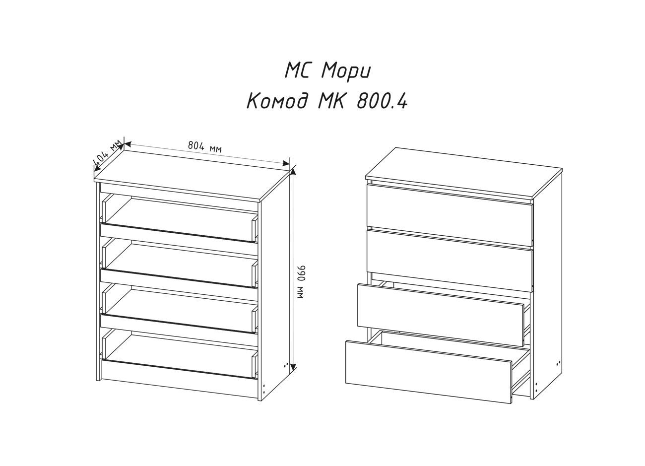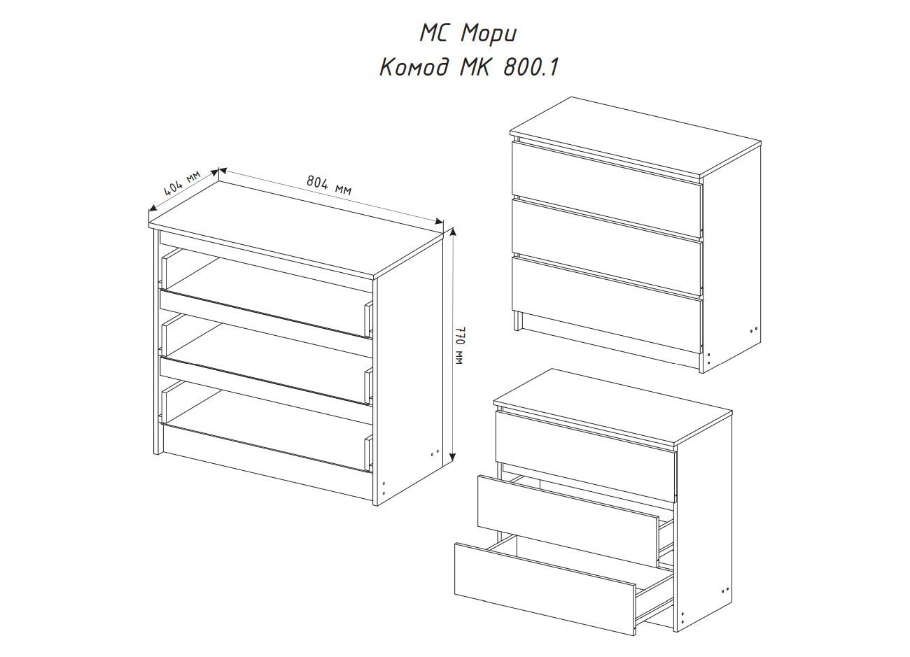 Комод с тремя выдвижными ящиками на роликовых направляющих. На фасадах отсутствуют ручки, функцию ручек выполняет сам фасад (его верхняя часть с внутренней стороны прямая под углом 90°). Открывание ящиков производится за счет пространства между планками и фасадом. Направляющие роликовые.Комод "Мори" сочетает в себе высокое качество, комфорт и выгодную цену .Идеально впишется в любой интерьер, а также позволит создать современный стиль в вашем доме и прослужит вам долгие годы. В комплекте с комодом идёт подробная инструкция по сборке, а так же весь необходимый крепёж