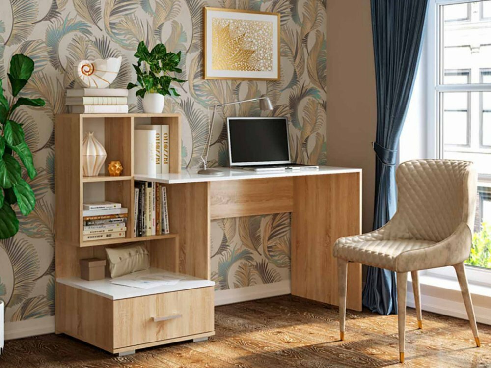 Стол выполнен в стильном цветовом решении - дуб сонома и белый, что придает ему современный и элегантный вид. Корпус и фасад изготовлены из качественного ЛДСП, обеспечивая долговечность и надежность конструкции.