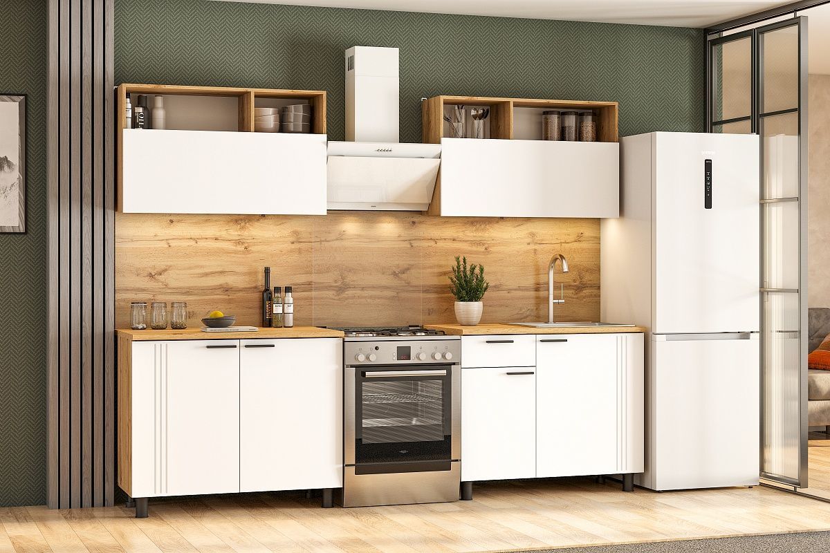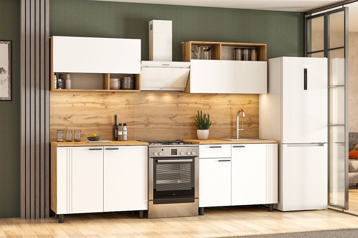 Особенностью кухонного гарнитура "Монако" является его дизайн. Он сочетает в себе цвета Дуб Золотой/Белый матовый/Дуб Вотан, что придает ему элегантный и современный вид.