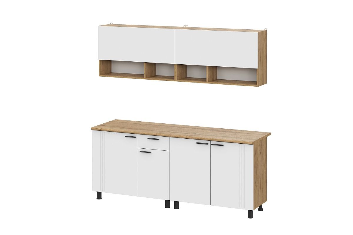 Кухонный гарнитур "Монако" имеет размеры 200 см в ширину и 84 см в высоту, что делает его подходящим для большинства кухонь. Глубина нижних шкафов составляет 44 см.