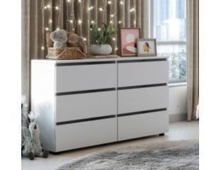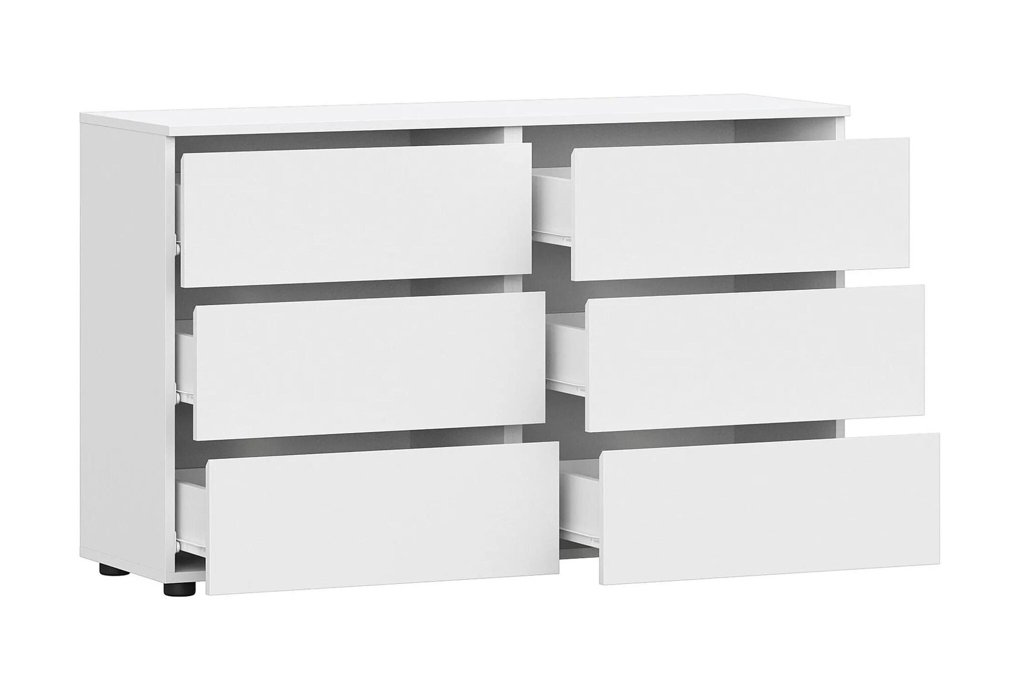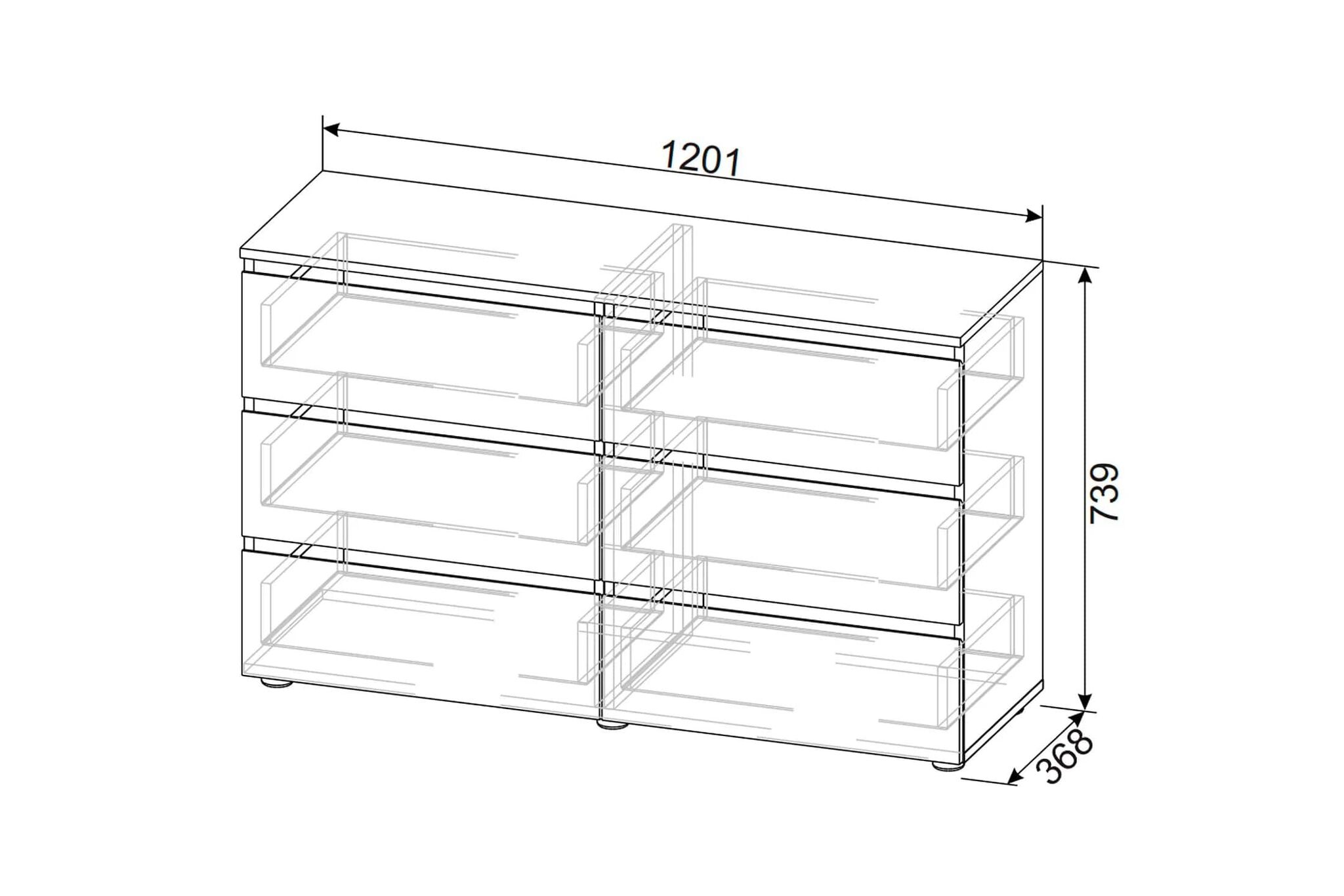 Комод предназначен для организации хранения вещей, белья или одежды и для этого у него есть целых шесть выдвижных ящиков по два в каждом из трех ярусов. На его верхней крышке вы сможете разместить рамки с фотографиями или декоративные элементы, что подчеркнет стиль интерьера комнаты.