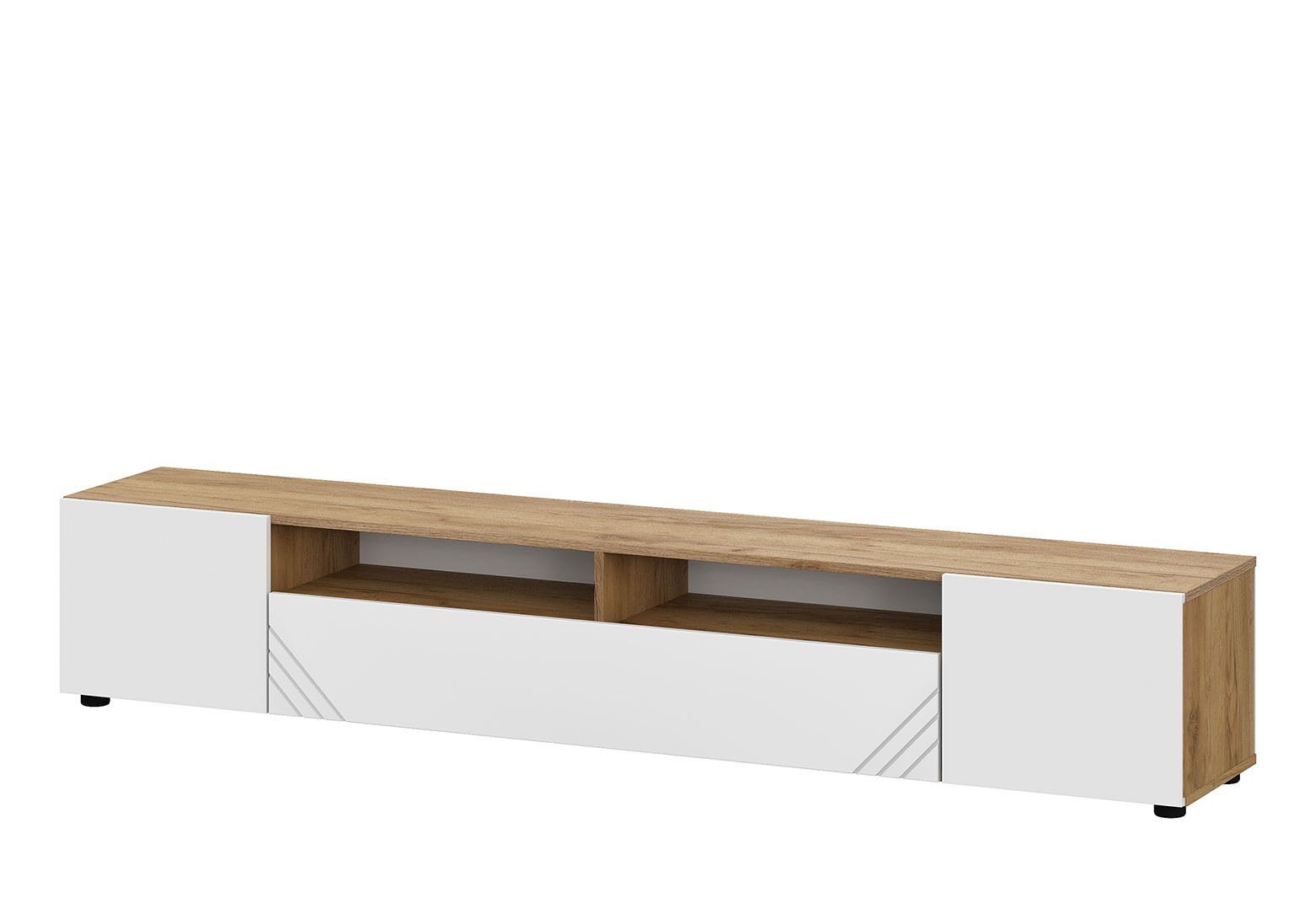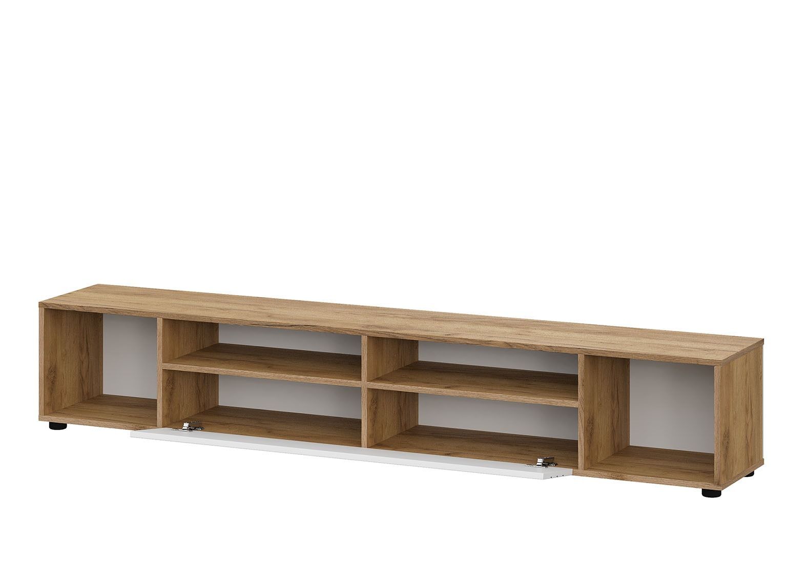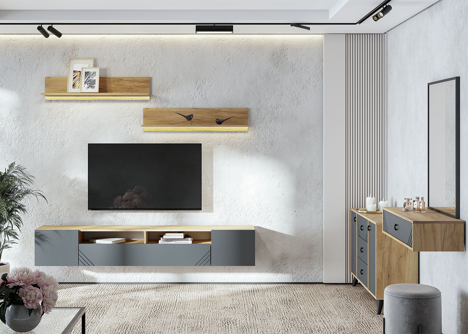 Гостиная «Байкал» имеет распашные МДФ-фасады с фрезеровкой в цвете Графит, за которыми скрываются вместительные отсеки для хранения техники и других вещей. Тумба под ТВ может быть установлена как на пол (в комплекте — пластиковые ножки), так и в подвесном виде. Петли у тумбы с доводчиками. Также в комплекте идут две навесные полки в цвете «Дуб Золотой».
