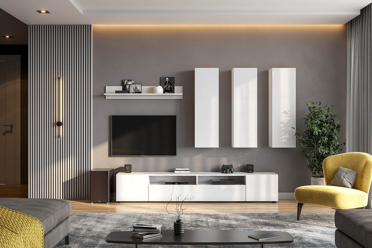 Модульная стенка в гостиную со шкафом Белый текстурный 230х35х135 см - это стильное и функциональное решение для вашей гостиной. Благодаря своему классическому дизайну, она прекрасно впишется в любой интерьер, будь то гостиная, детская комната, домашний кинотеатр, кабинет или офис.