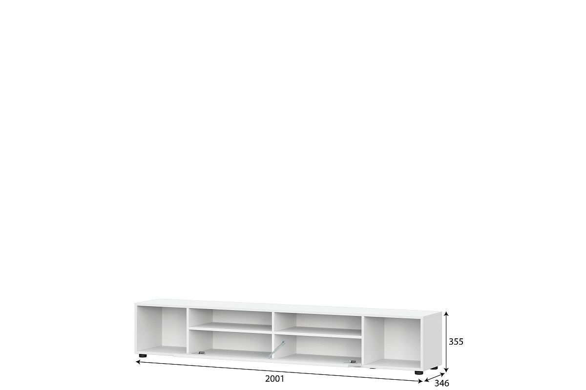 В комплект входят тумба под ТВ, полка и подвесной шкаф. Ширина ниши под ТВ составляет 200 см, что позволяет разместить телевизор с большим экраном.