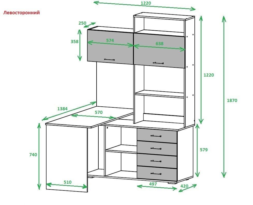 - Рабочая зона стола: 1384*1220 мм по ширине, 570*440 мм по глубине и 550 мм по высоте.