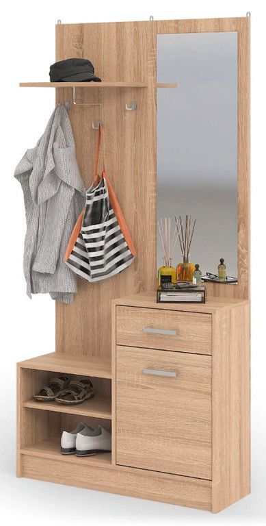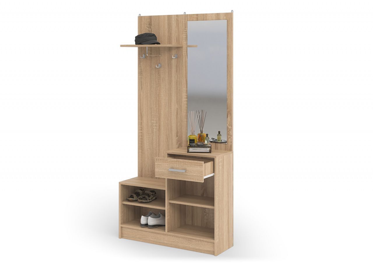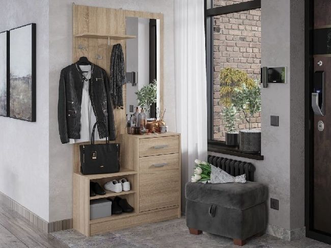 Прихожая подойдет для небольшого коридорчика, общая ширина составляет всего 900 мм. Цветовое решение: ясень анкор светлый или дуб сонома.