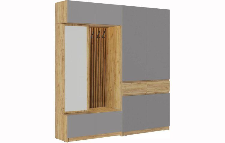 Выполненная в скандинавском стиле прихожая «Бостон» состоит из навесной антресоли, вместительной напольной тумбы, шкафа-пенала с зеркалом, а также из стильной стенки-вешалки, выполненной из профилей.