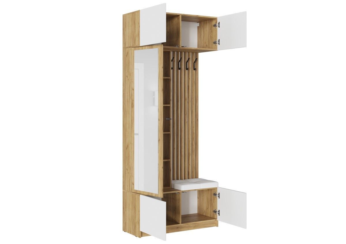 Выполненная в скандинавском стиле прихожая «Бостон» состоит из навесной антресоли, вместительной напольной тумбы, шкафа-пенала с зеркалом, а также из стильной стенки-вешалки, выполненной из профилей.