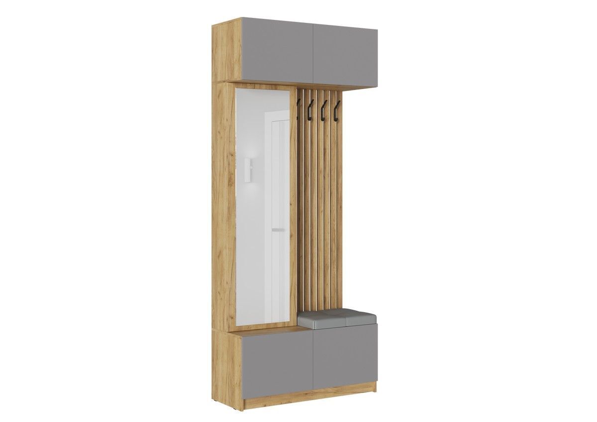 Выполненная в скандинавском стиле прихожая «Бостон» состоит из навесной антресоли, вместительной напольной тумбы, шкафа-пенала с зеркалом, а также из стильной стенки-вешалки, выполненной из профилей.