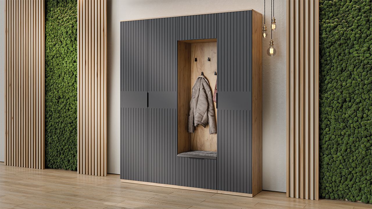 Прихожая с вешалкой - это комплект мебели, который включает в себя вешалку, шкаф для одежды, пуфик и полку.