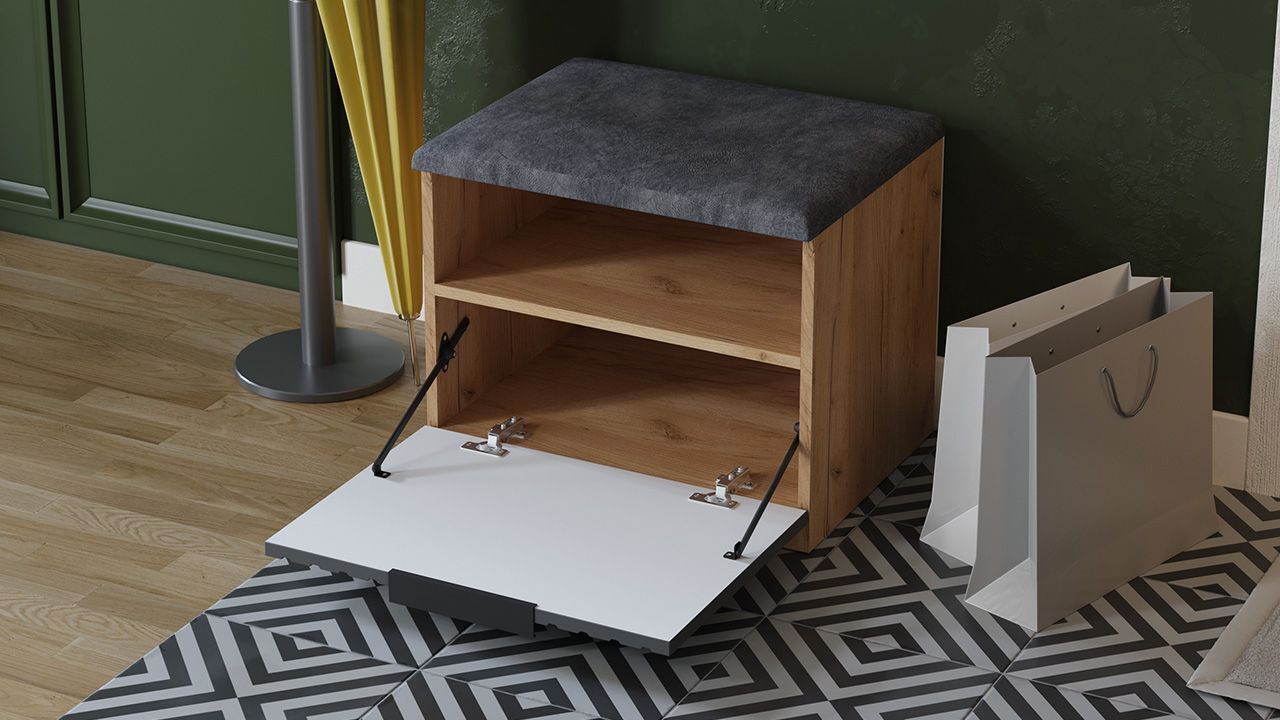 Особенностью данной модели является наличие вешалки с обувницей и полками. Это позволяет удобно разместить верхнюю одежду и обувь, а также хранить различные мелочи.