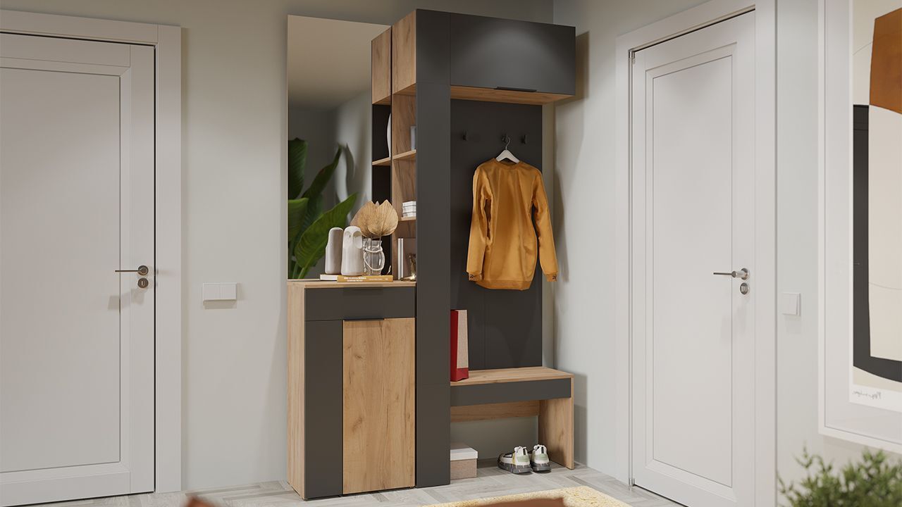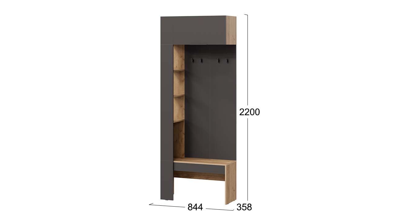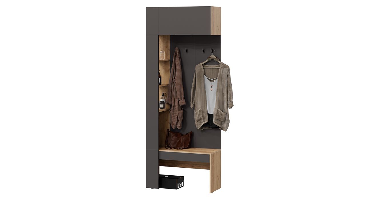 Особенностью данного комплекта является наличие вешалки со штангой для вешалок, обувницы, полок и ящиков. Это позволяет удобно разместить одежду, обувь и аксессуары.