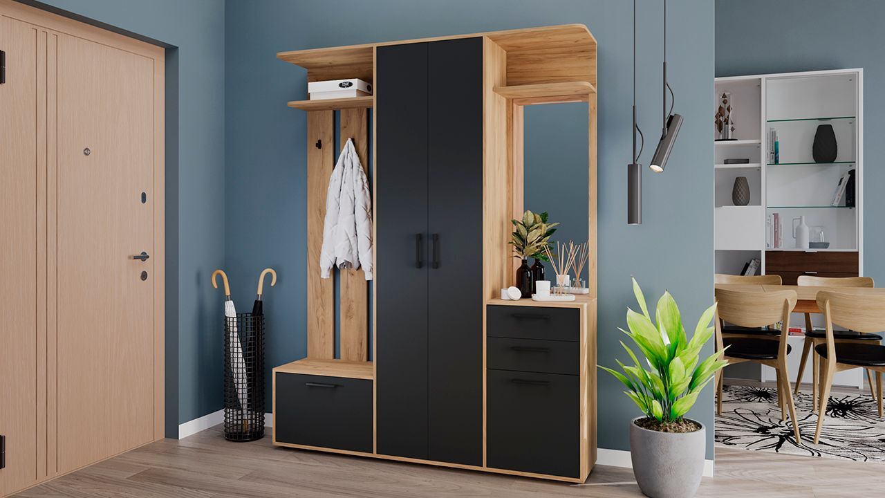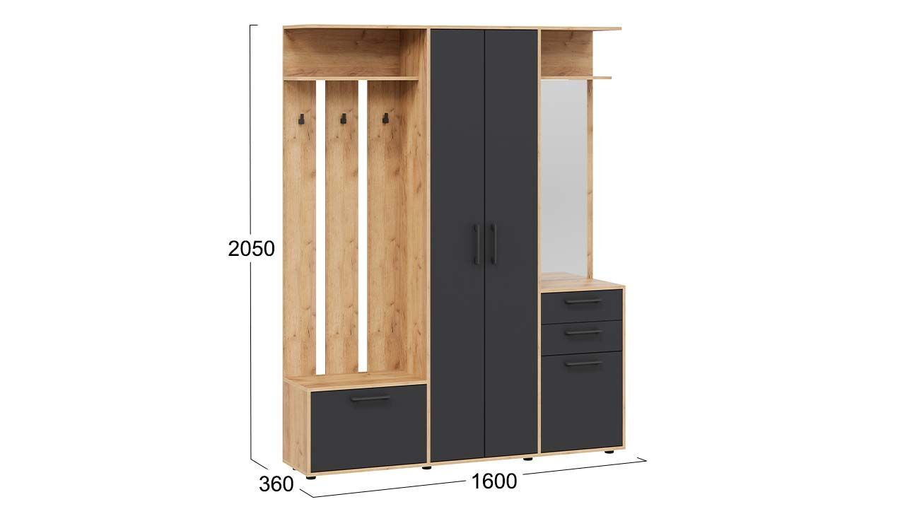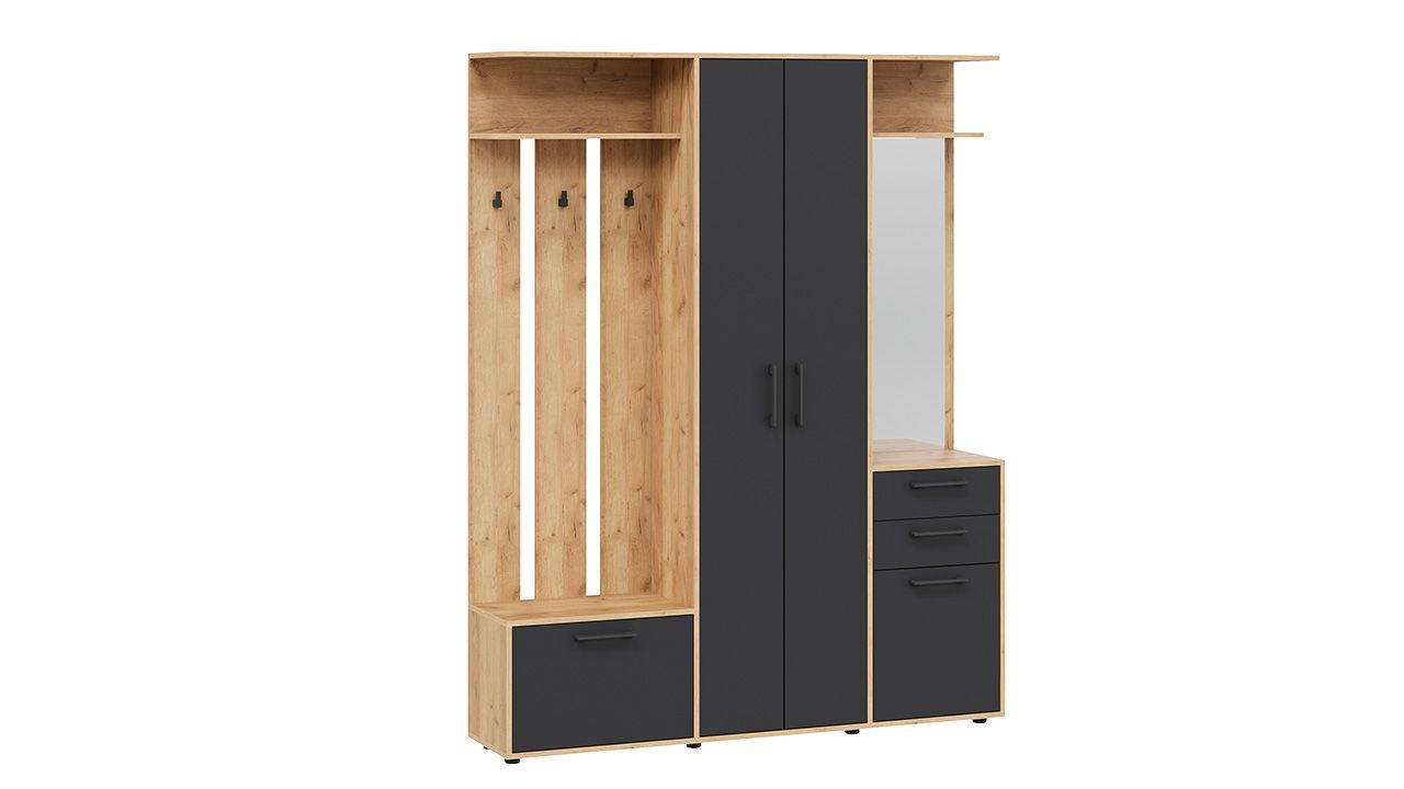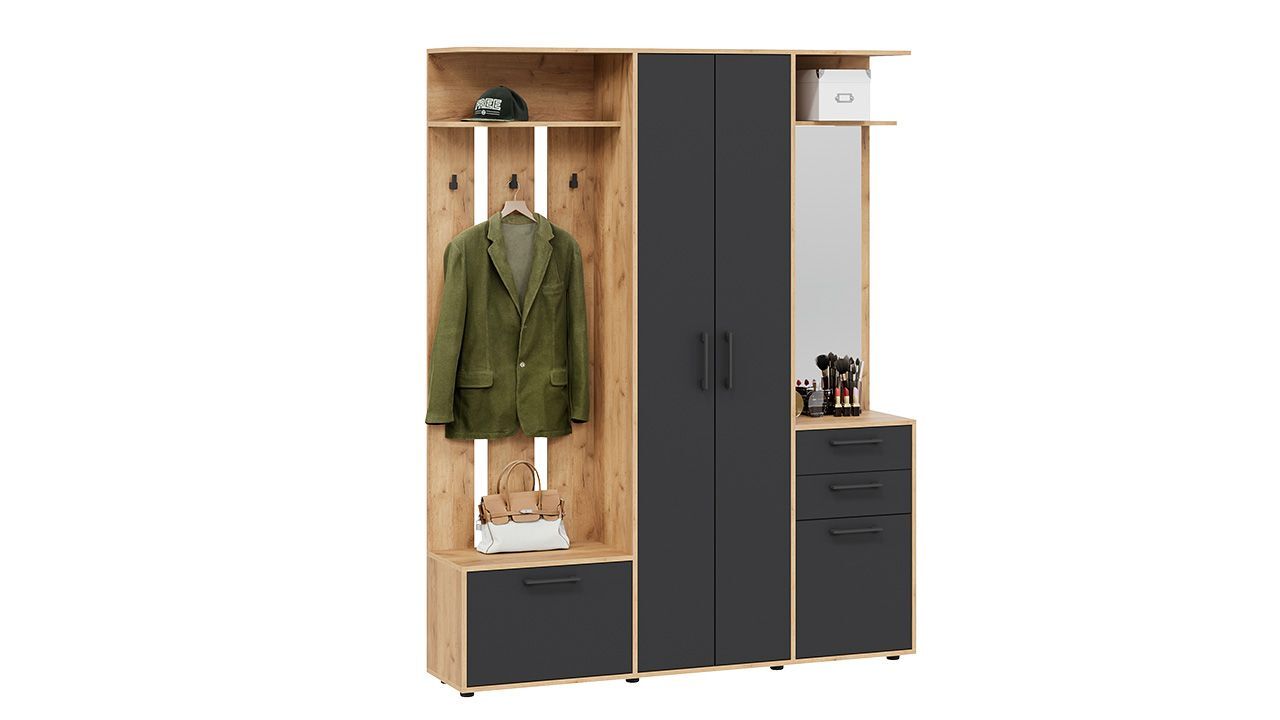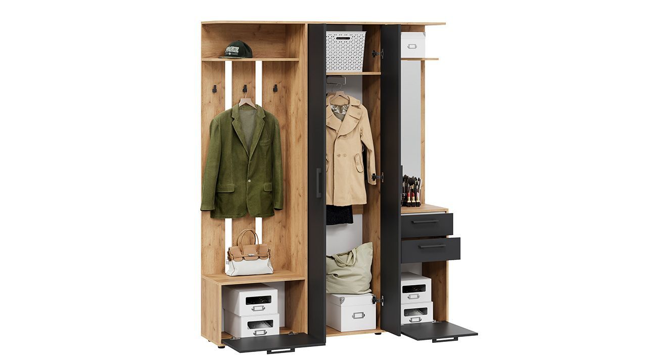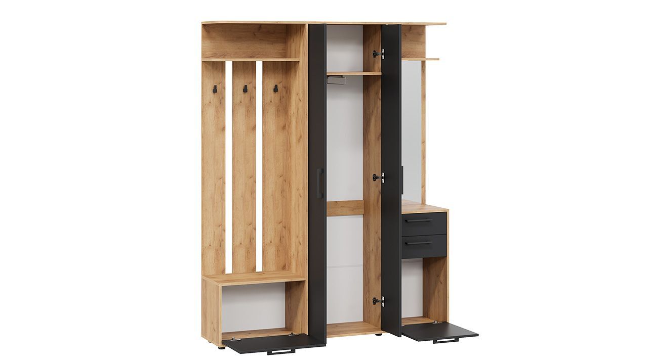 Особенностью данного комплекта является наличие вешалки со штангой для вешалок, обувницы, полок и ящиков. Это позволяет удобно разместить одежду, обувь и аксессуары.