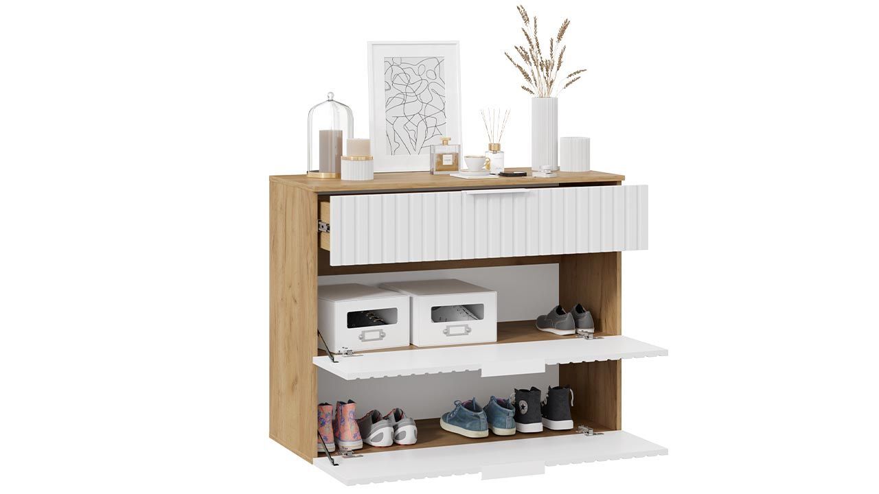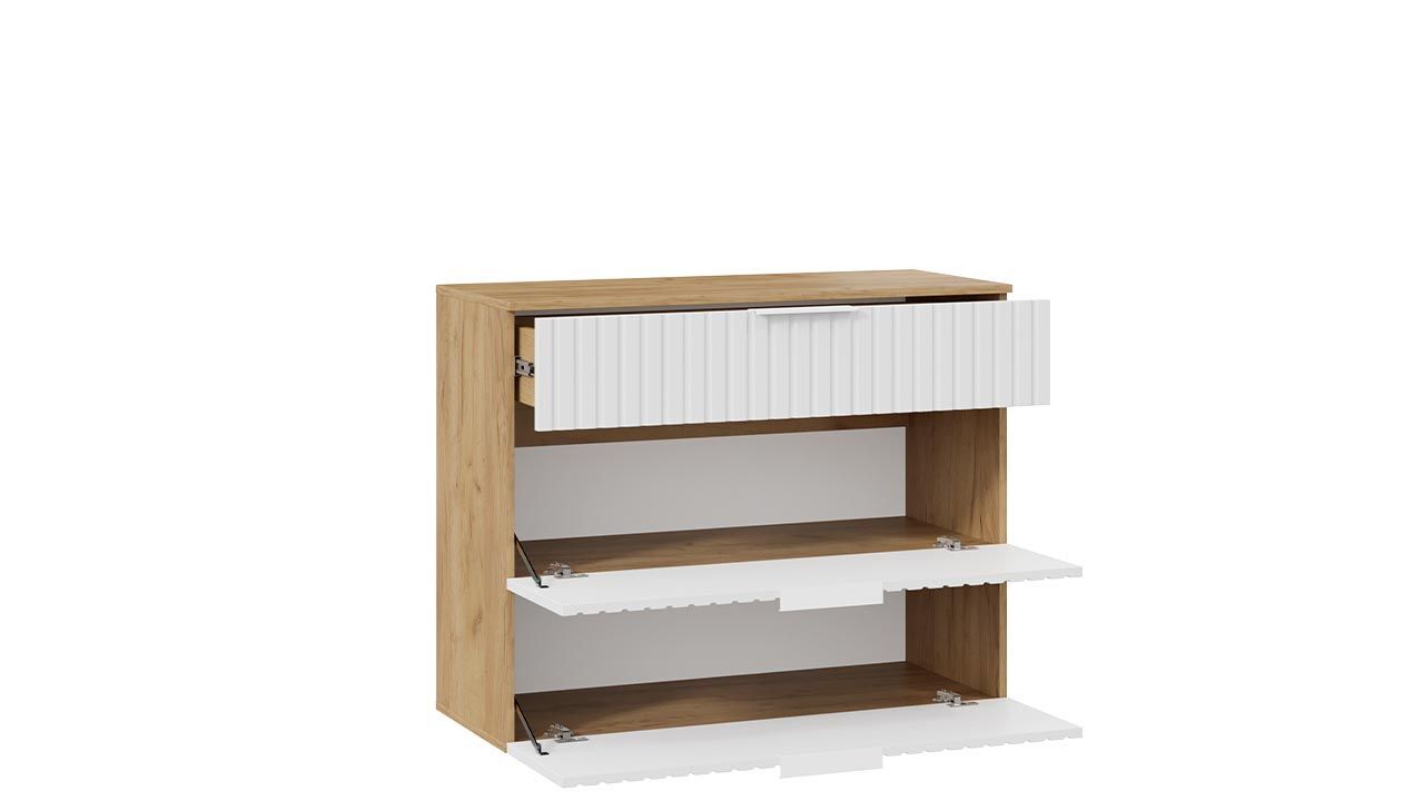 Прихожая выполнена в современном стиле, сочетающем бежевый и белый цвета. Цвет Дуб Крафт золотой придает изделию оригинальность и изысканность.