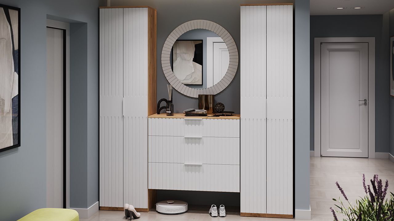 Прихожая с зеркалом - это комплект мебели, который включает в себя шкаф для одежды, комод, зеркало и обувницу.