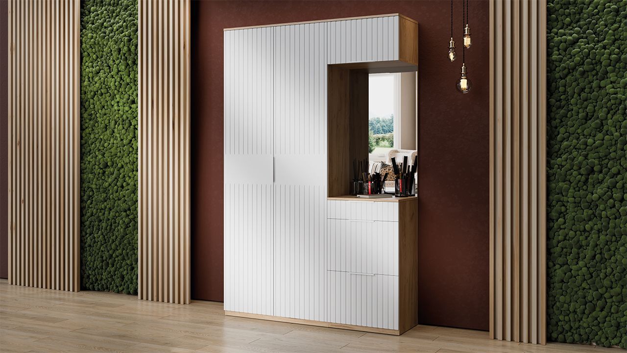 Зеркало, входящее в комплект, поможет визуально увеличить пространство прихожей и сделает ее более светлой и просторной.