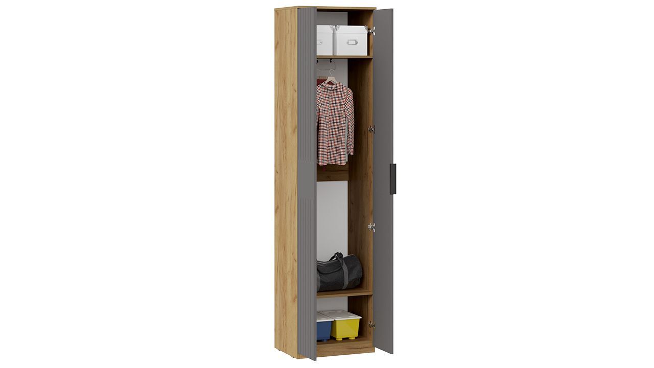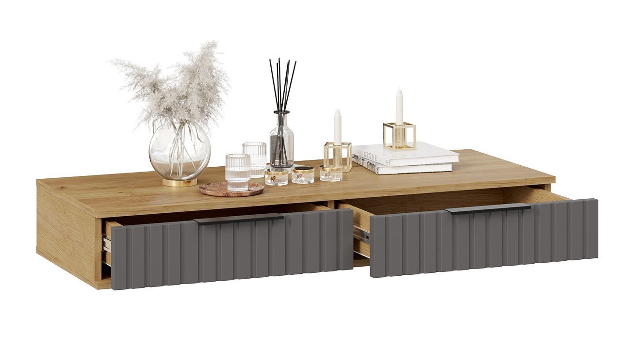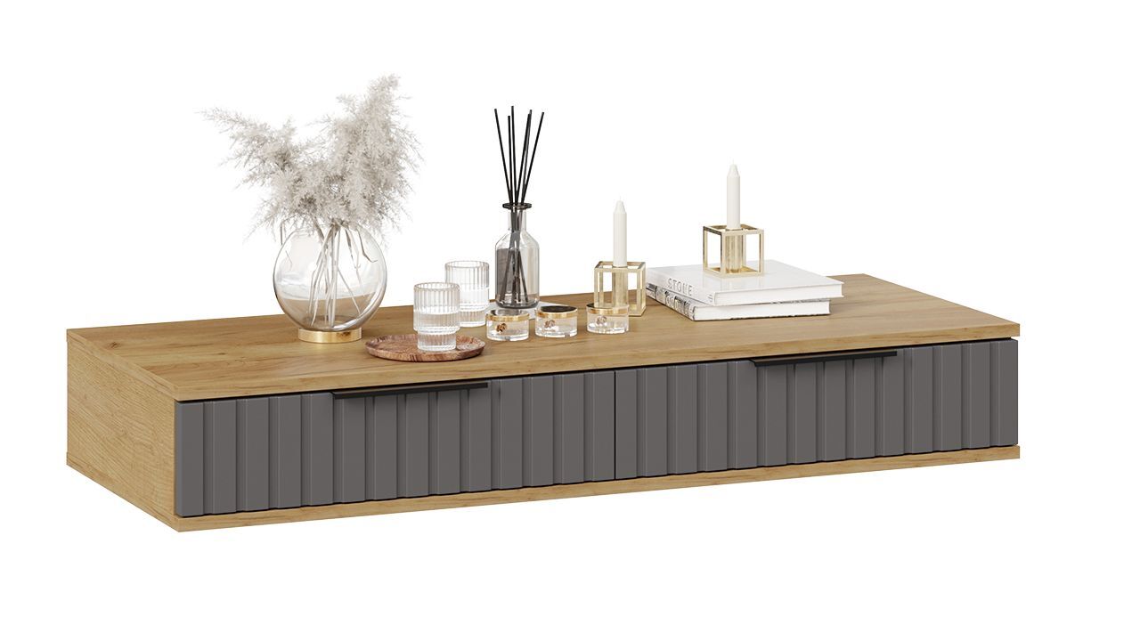 Прихожая выполнена в современном стиле, сочетающем бежевый и темно-серый цвета. Цвет Дуб Крафт золотой/Графит матовый придает изделию изысканный и элегантный вид.