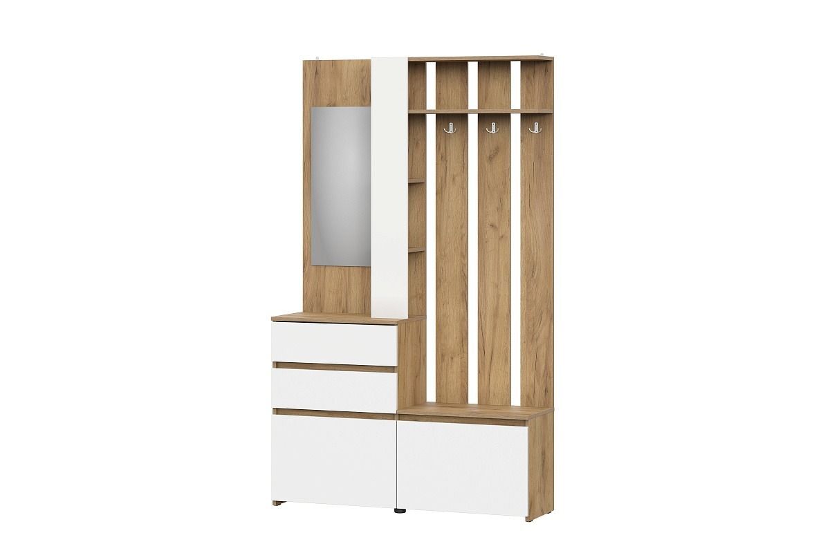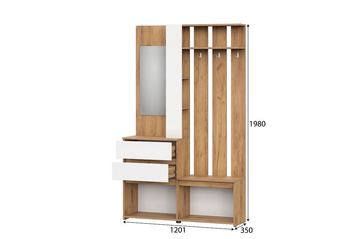 Прихожая с зеркалом - это комплект мебели, который сочетает в себе функциональность и эстетику. Изготовлена из качественного ЛДСП, что обеспечивает долговечность и надежность. Цвет Дуб Золотой/Белый придает изделию современный и стильный вид.