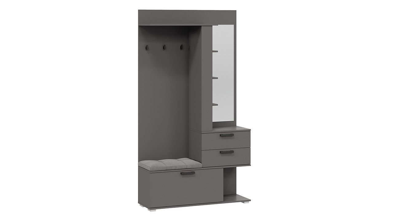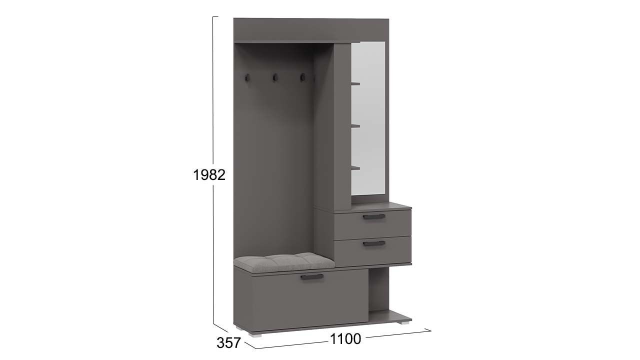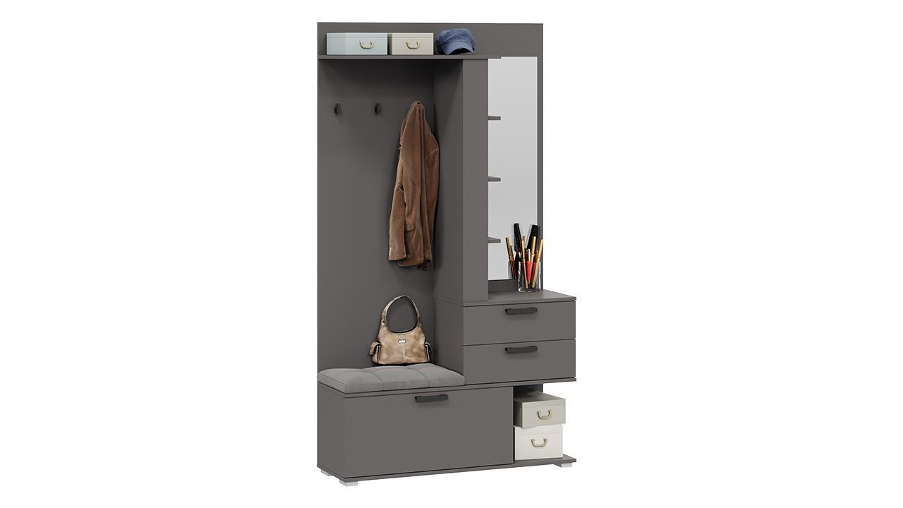 Прихожая с зеркалом "Графит Серый" представляет собой комплект мебели, состоящий из шкафа для одежды, вешалки, комода, обувницы, зеркала, полки и пуфика. Размеры прихожей составляют 164х36х200 см, что позволяет разместить ее даже в небольших помещениях.