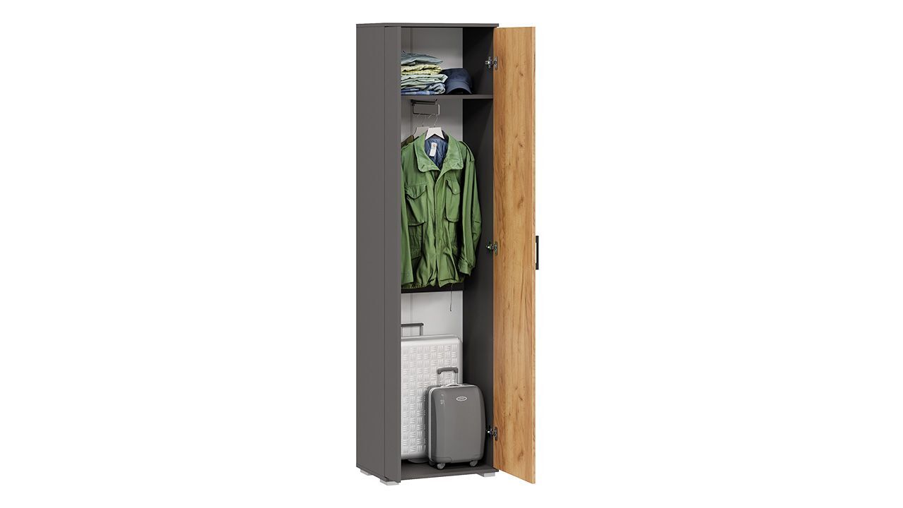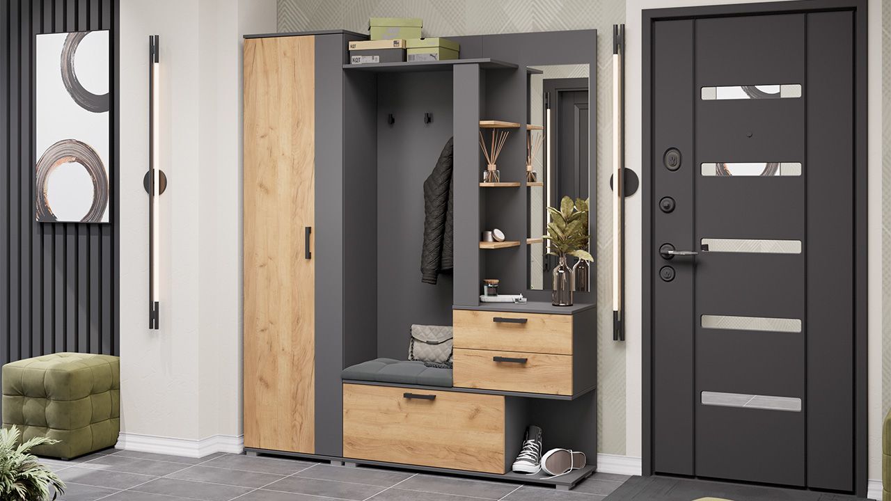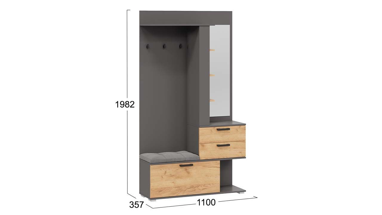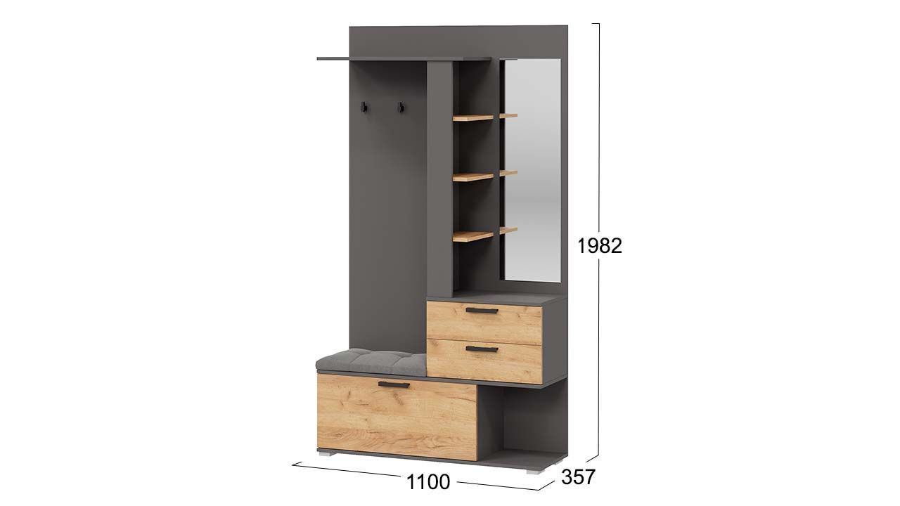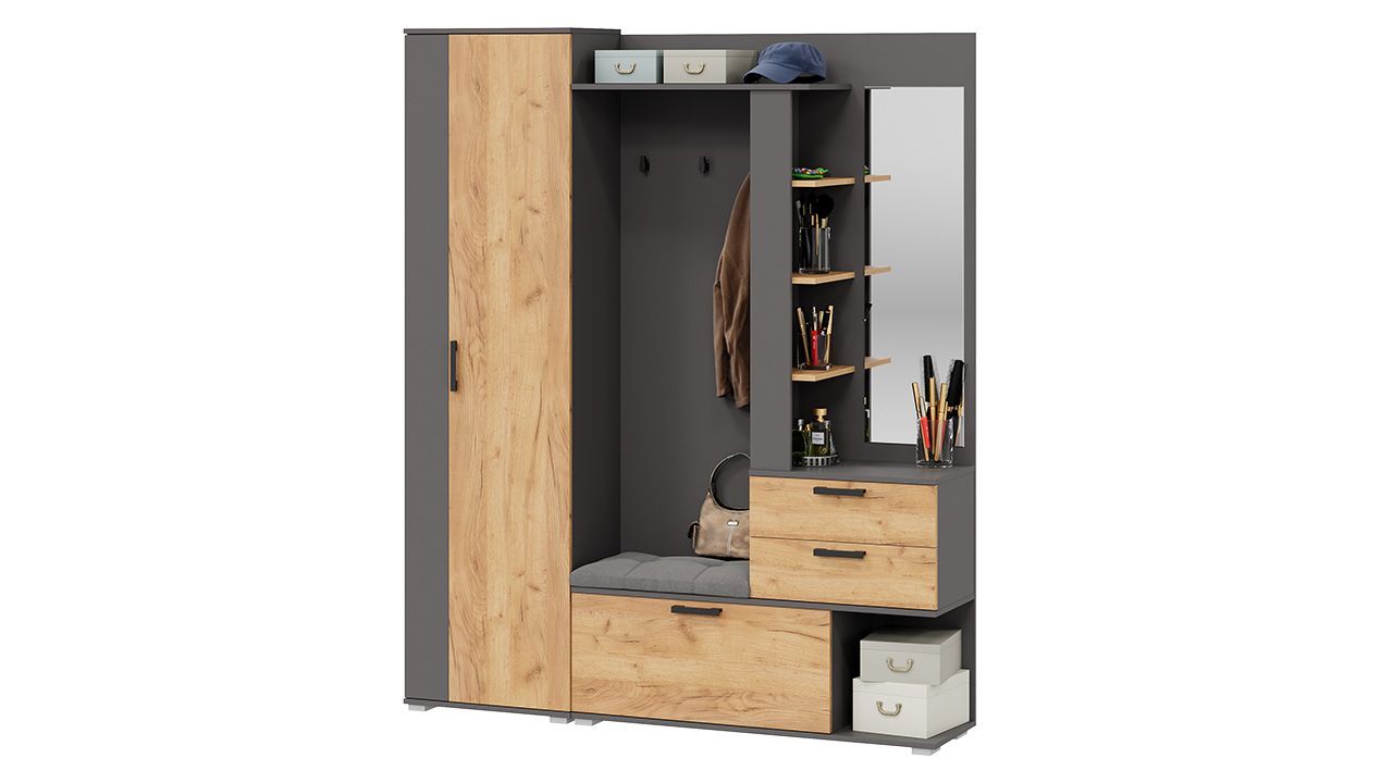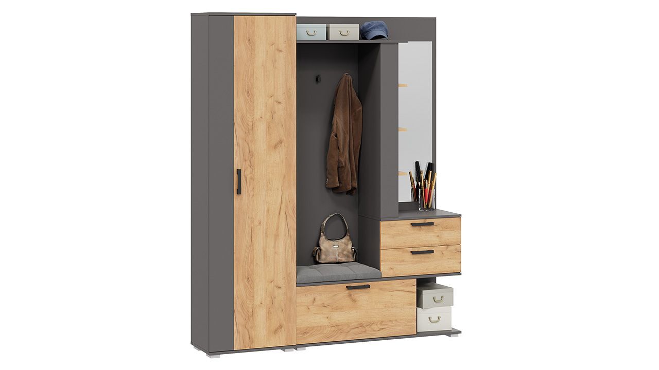 Прихожая с зеркалом "Графит Серый/Дуб Крафт золотой" - это комплект мебели, который станет стильным и функциональным дополнением вашего интерьера.