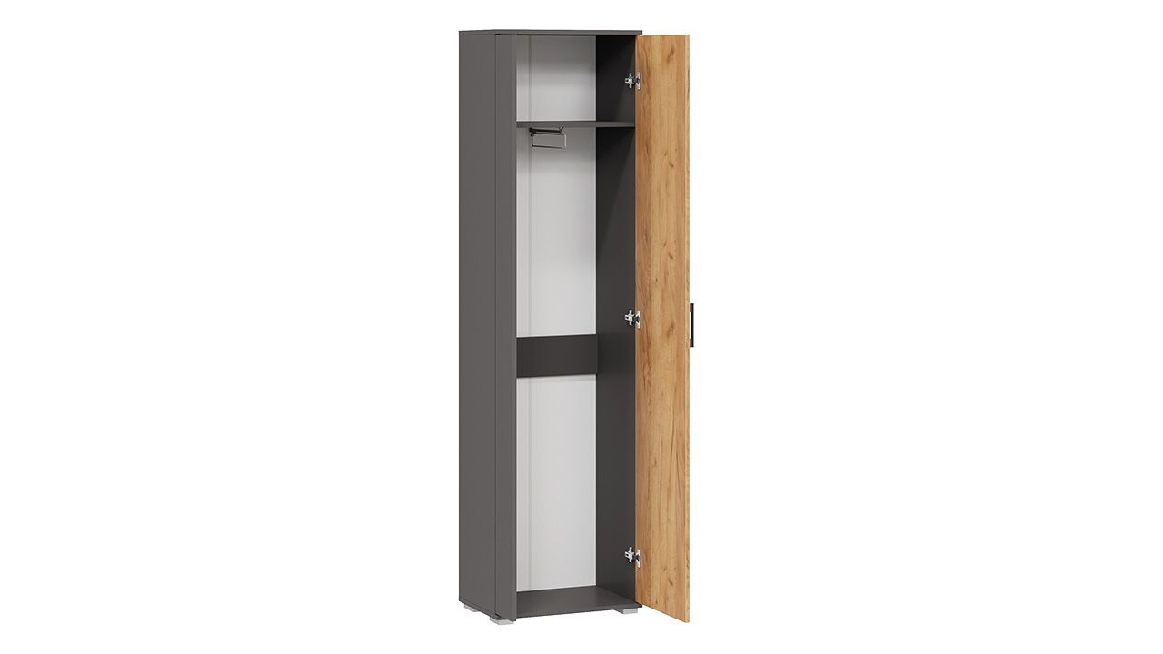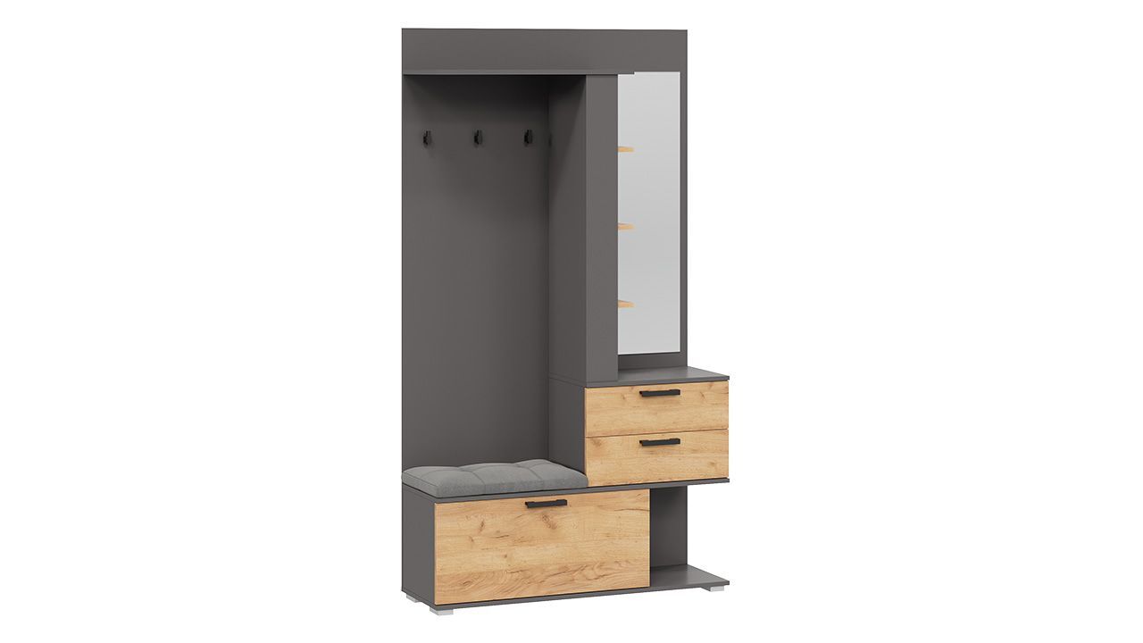 Прихожая выполнена в современном стиле, что позволяет ей гармонично вписаться в любой интерьер. Цвет комплекта - темно-серый с бежевыми оттенками, что создает уютную и теплую атмосферу.