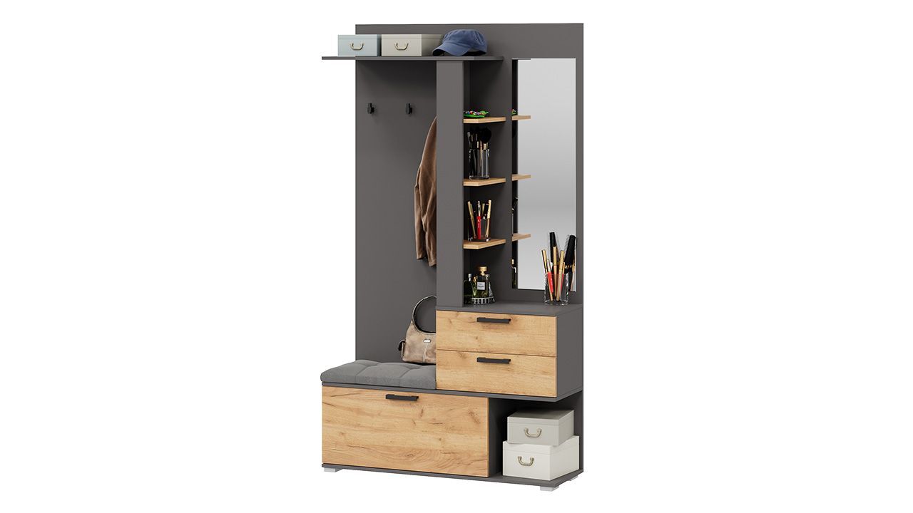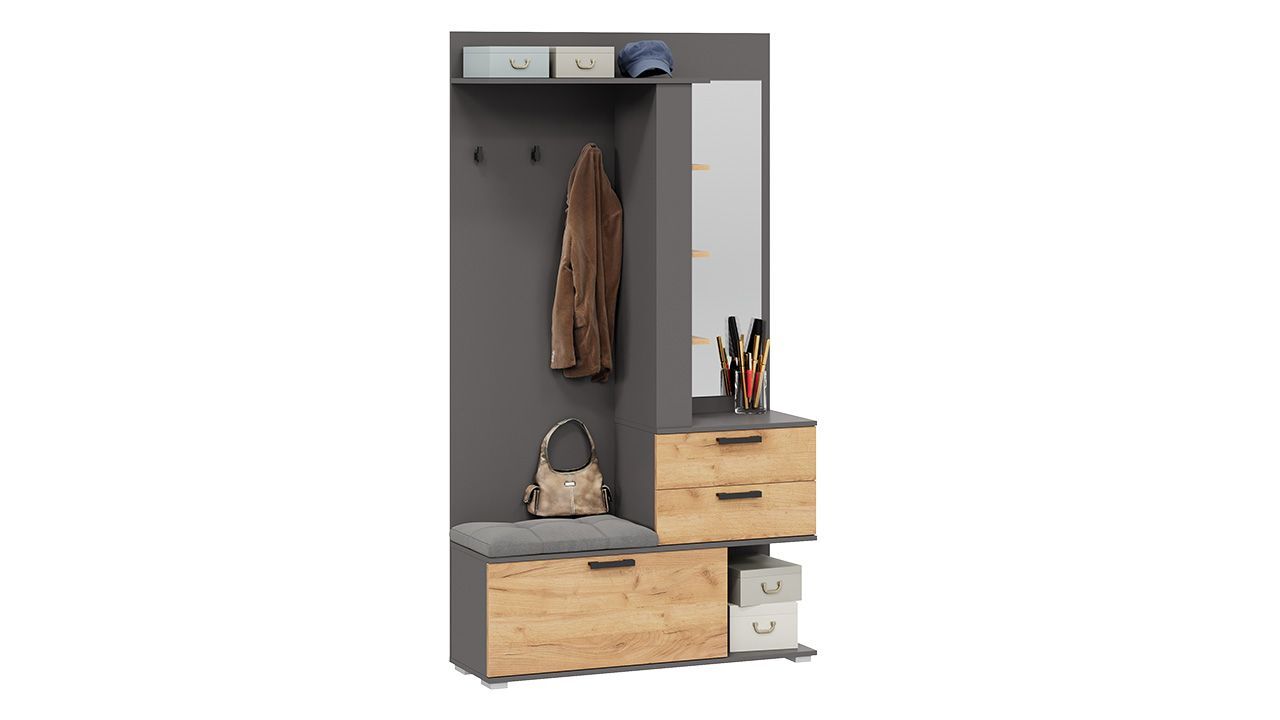 В состав комплекта входят такие элементы, как шкаф для одежды, вешалка, комод, обувница, зеркало, полка и пуфик. Это позволяет максимально эффективно использовать пространство прихожей и хранить все необходимые вещи.