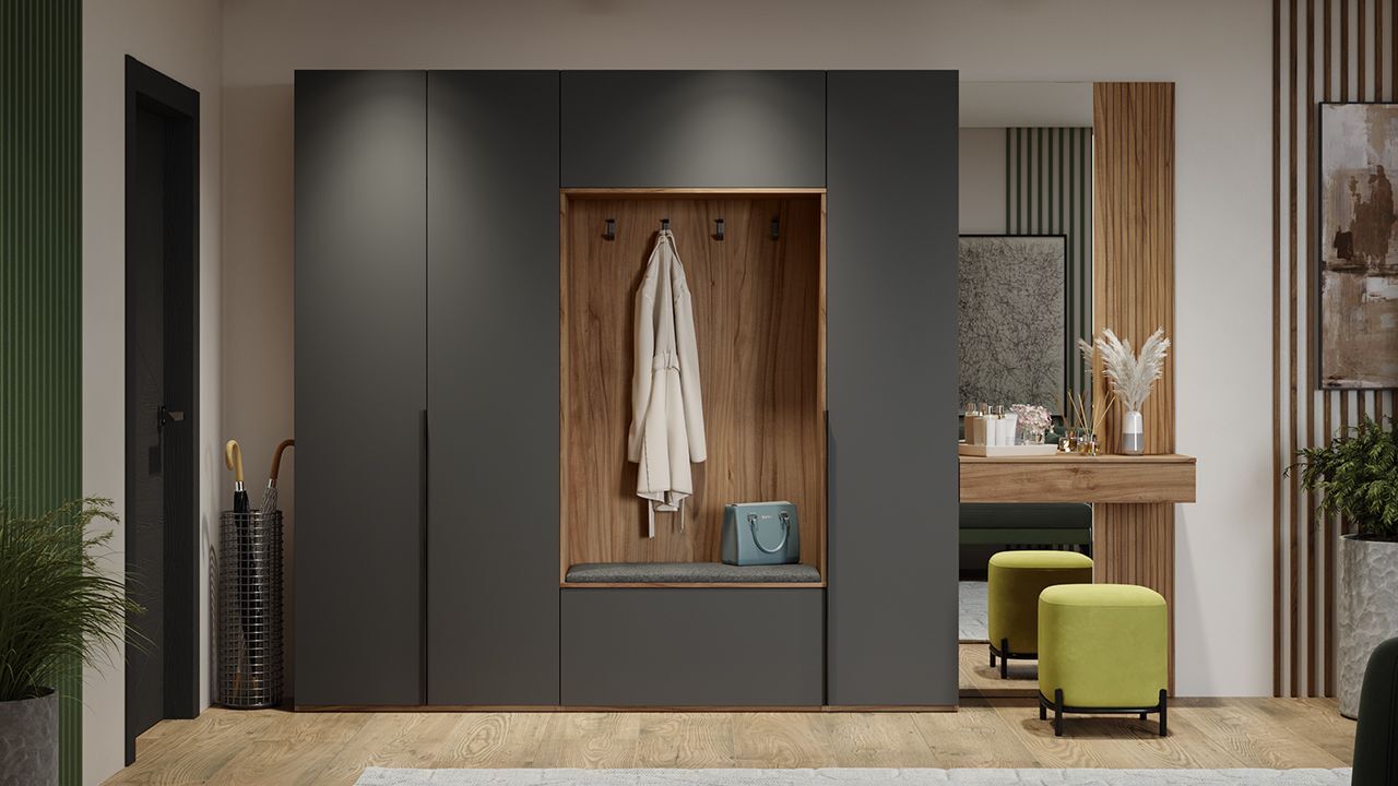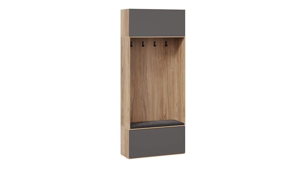 Прихожая с зеркалом "Яблоня Беллуно/Графит софт" - это комплект мебели, который включает в себя вешалку, шкаф для одежды, консоль, обувницу и зеркало.