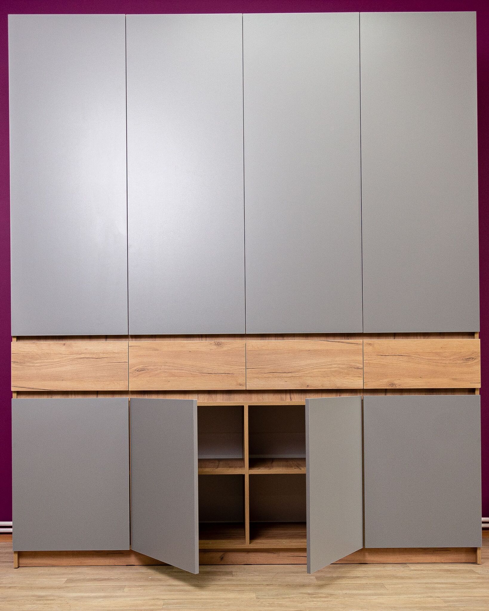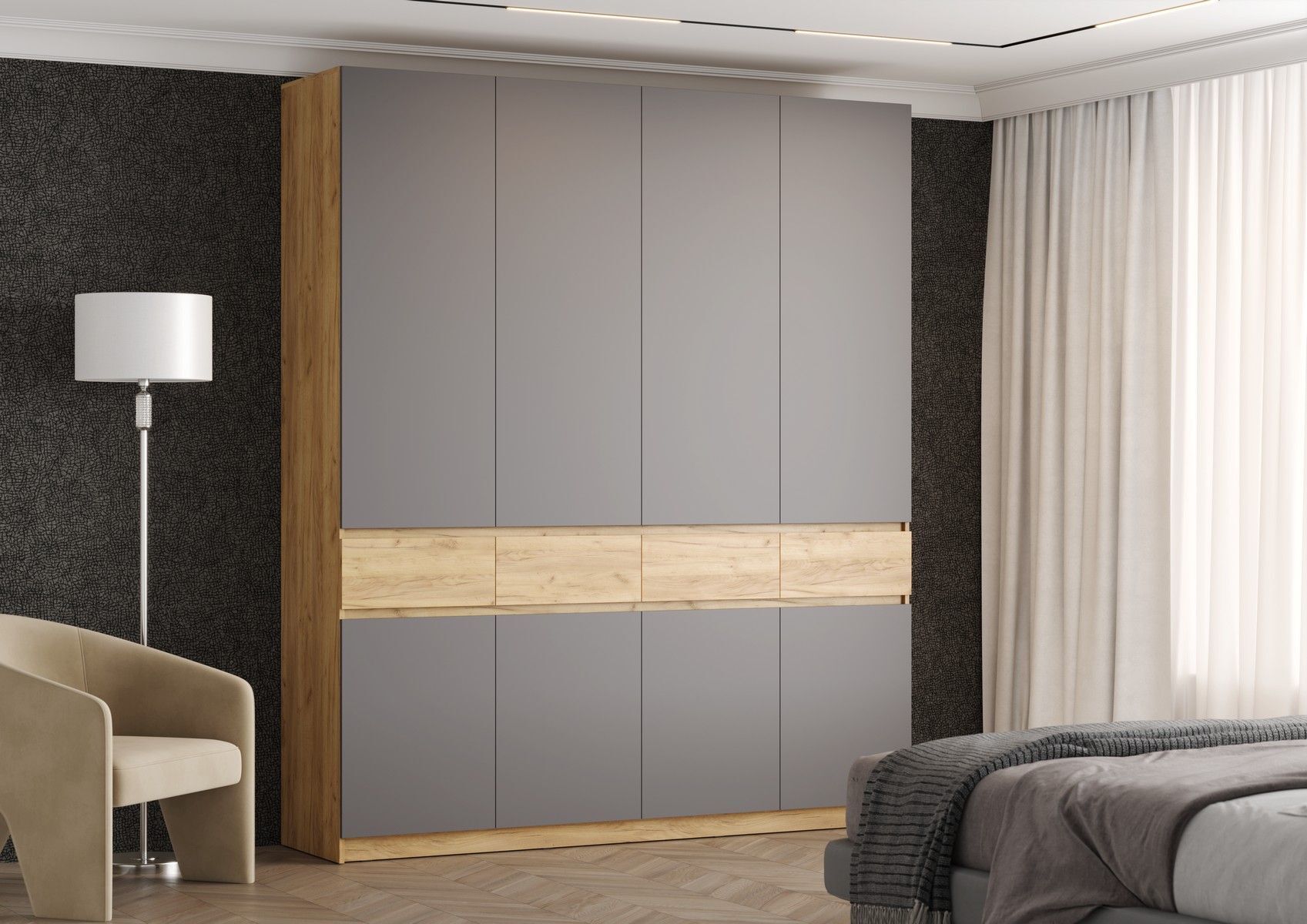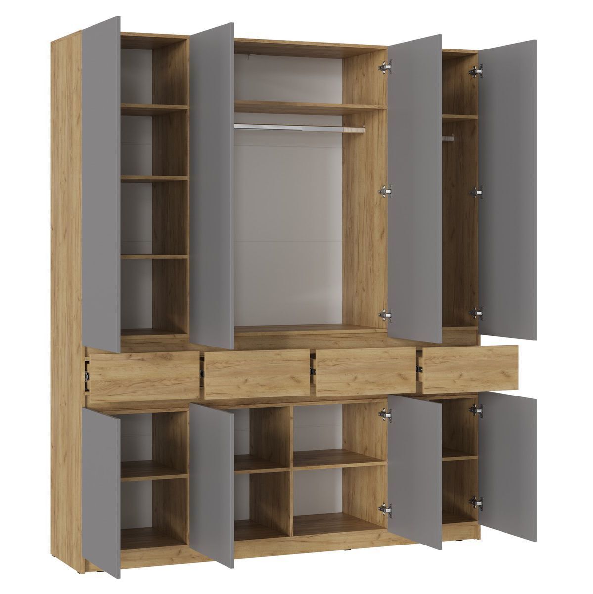 Шкаф распашной предлагает удобное открытие дверей, что позволяет вам быстро и легко получить доступ к хранимым вещам. Благодаря своей конструкции с распашными дверями, он занимает меньше пространства, чем шкафы со скользящими дверями, что особенно актуально для небольших помещений.