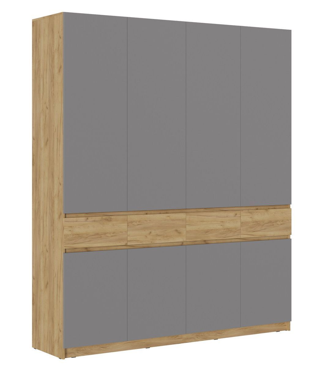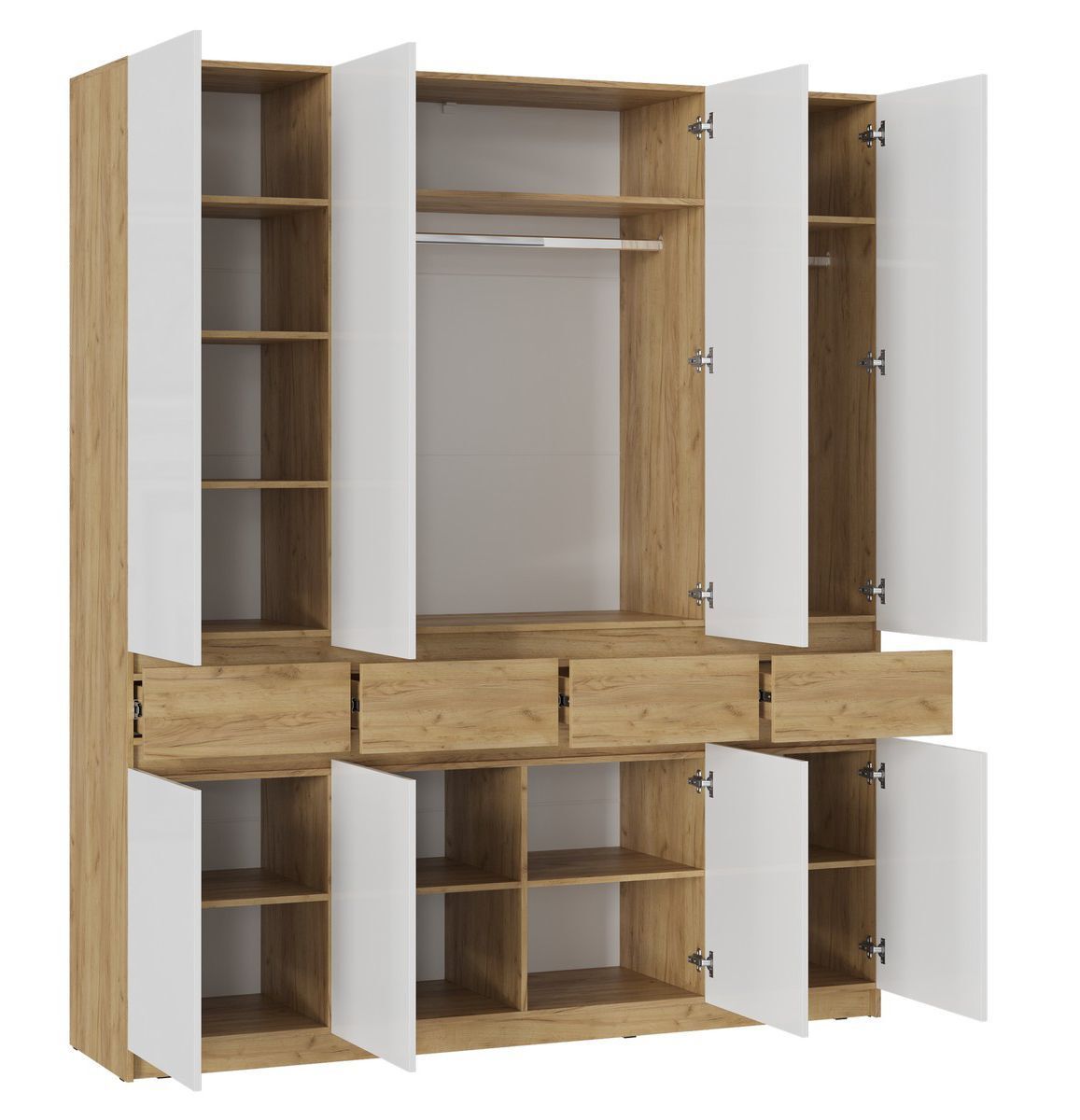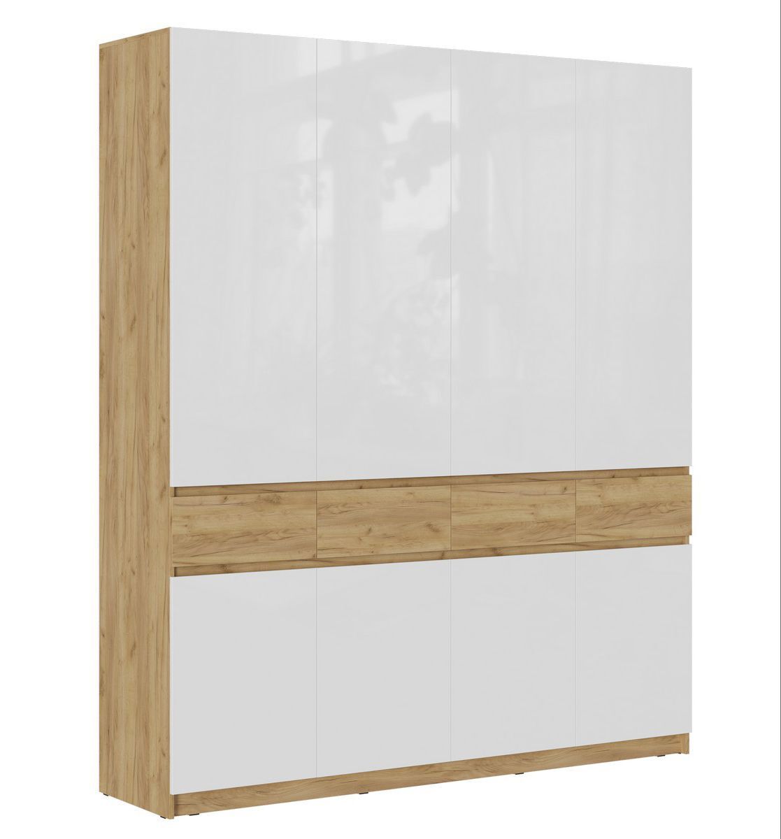 Этот многофункциональный шкаф отличается продуманным дизайном – он выполнен без ручек, с элегантными зазорами между фасадами, украшенными декоративными планками. В нем размещены две удобные металлические штанги для одежды и множество вместительных полок. Благодаря высоте шкаф максимально задействует ограниченное пространство вашей квартиры. Более того, несколько таких моделей можно объединить в единую систему хранения "Бостон". Ящики оснащены шариковыми направляющими для плавного хода, а сам шкаф легко собирается благодаря универсальной системе монтажа. **Основные характеристики:** - Материал корпуса/фасада: ЛДСП/ЛДСП+МДФ/ЛДСП+ЛДСП, толщиной 16 мм - Задняя стенка: ЛХДФ, 3,2 мм - Цвета: дуб крафт золотой / глянцевый белый - Габариты (ШхВхГ): 1996 x 2360 x 510 мм - Масса: 213 кг - Объем: 0,382 куб.м - Кромка: ПВХ, 0,4 мм - Две штанги длиной 961 мм и 477 мм - Тип направляющих: шариковые полного выдвижения -