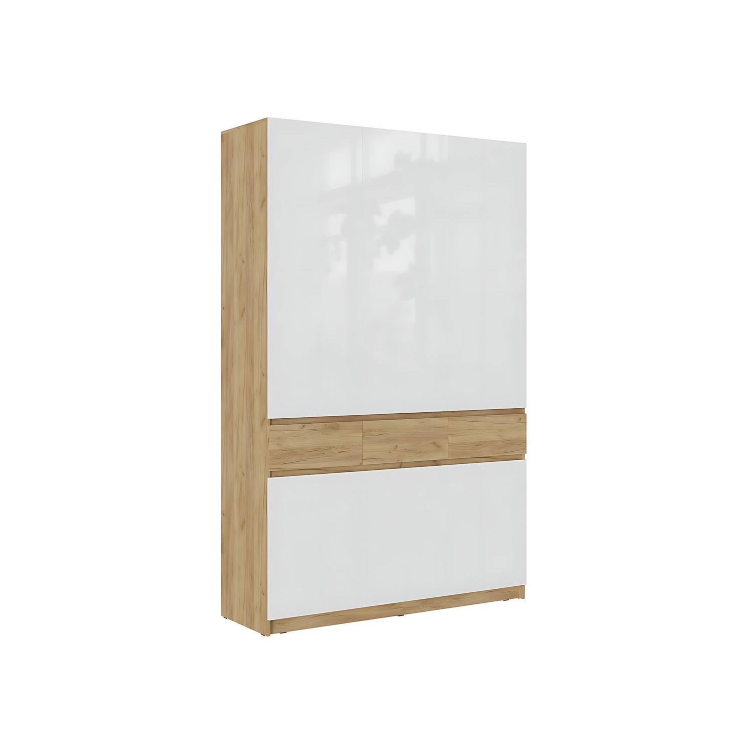 • Шкаф предусматривает наличие трех выдвижных ящиков, двух вместительных отсеков для одежды, а также множества полок
