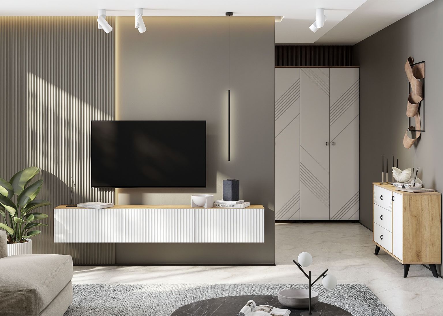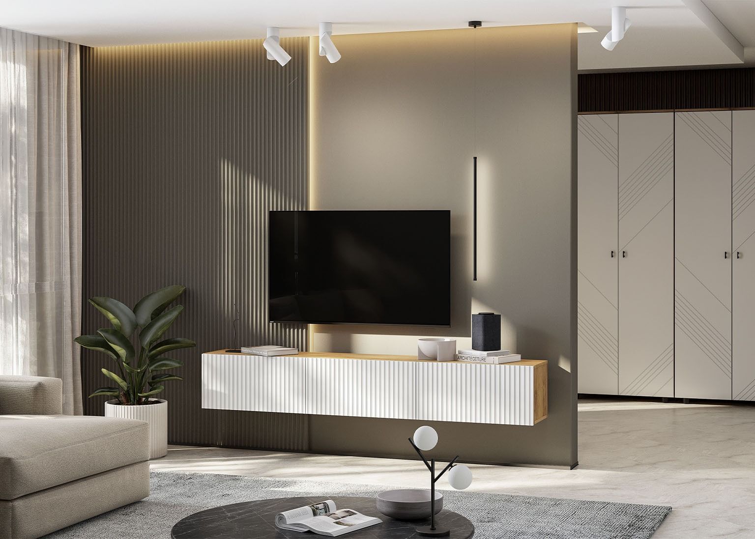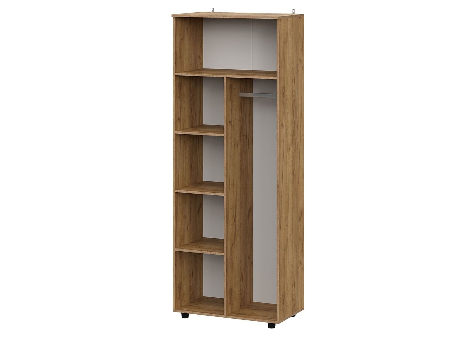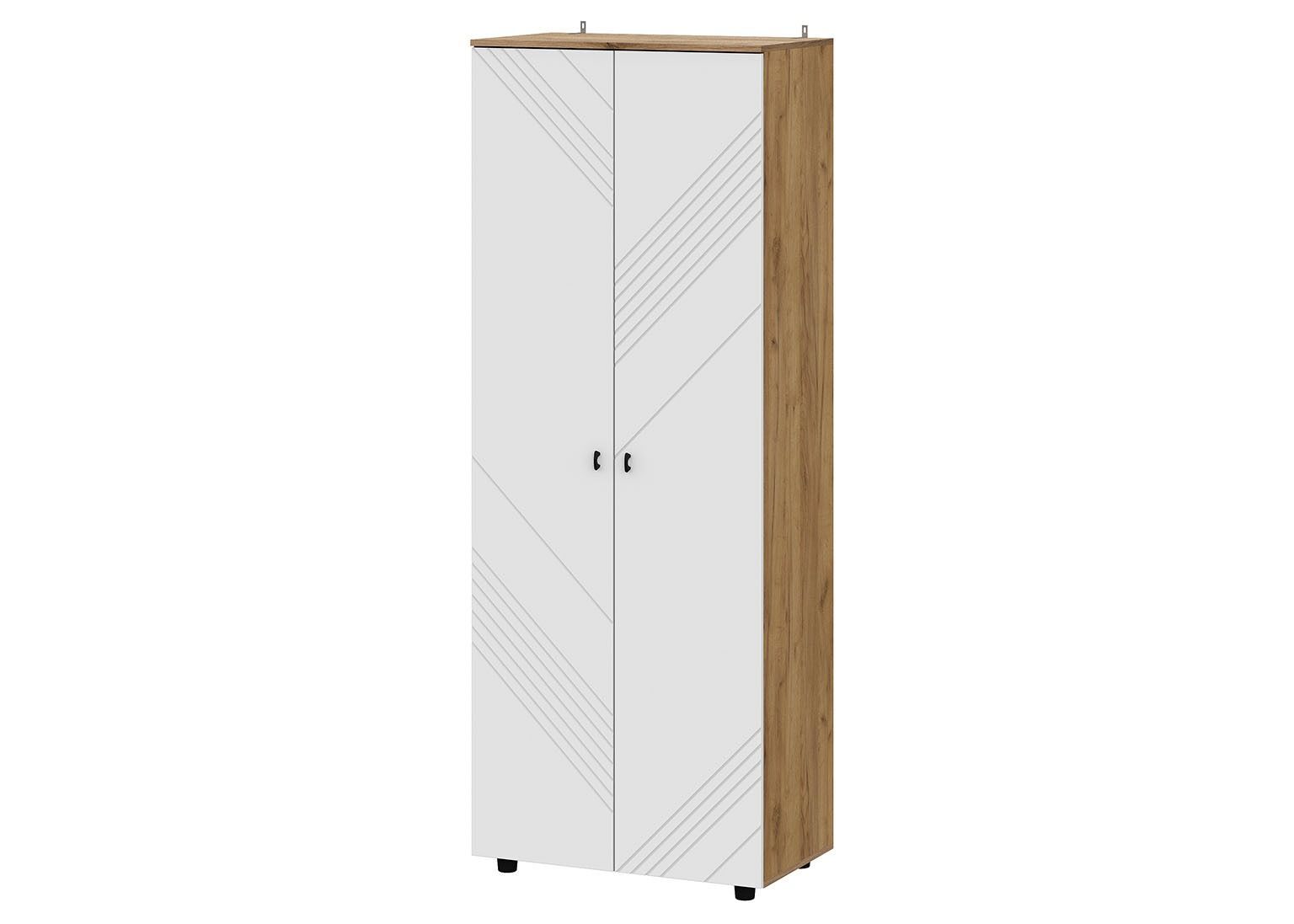 Шкаф «Байкал» с двумя распашными створками — стильное решение для современных интерьеров. Фасады из МДФ с выразительной фрезеровкой и чёрные пластиковые ручки подчёркивают лаконичный дизайн. Внутреннее пространство поделено на полки и отсек со штангой, что делает шкаф универсальным для хранения. Модель дополнена креплениями к стене и установлен на четырёх невысоких чёрных ножках.