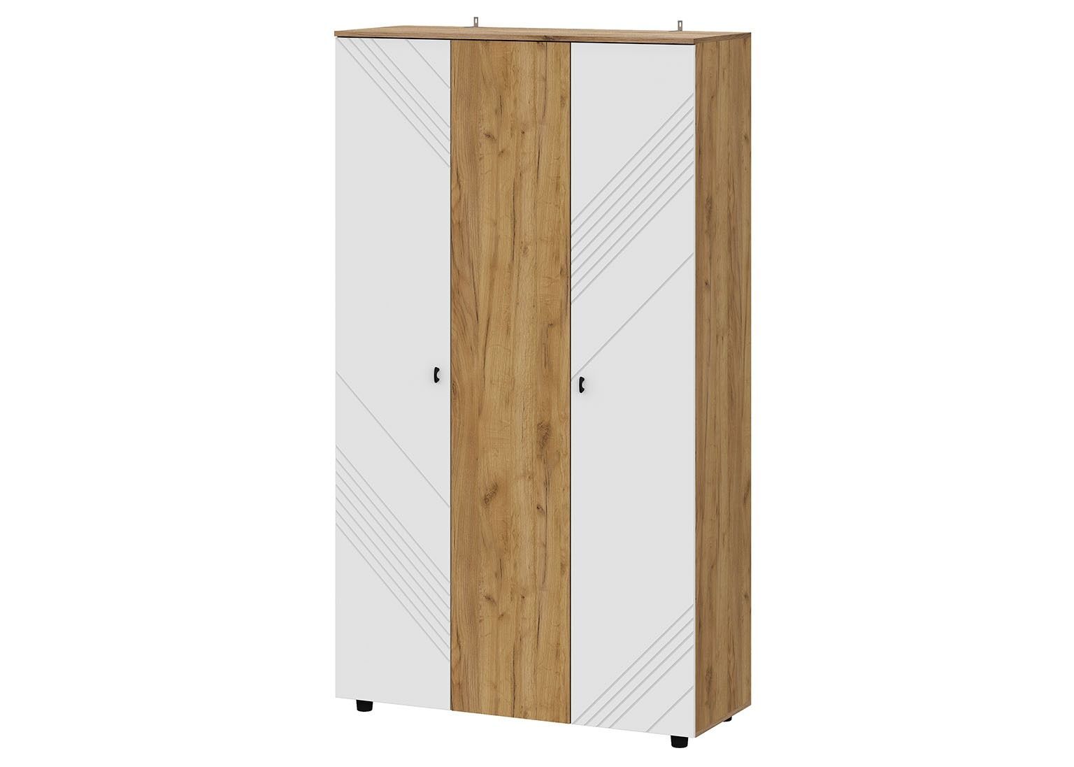 Трехстворчатый шкаф "Байкал" - это сочетание современного дизайна и функциональности. Центральная дверь выполнена в теплом оттенке "Дуб Золотой", боковые створки - из МДФ цвета графит с фрезеровкой. Черные ручки дополняют гармоничный образ.