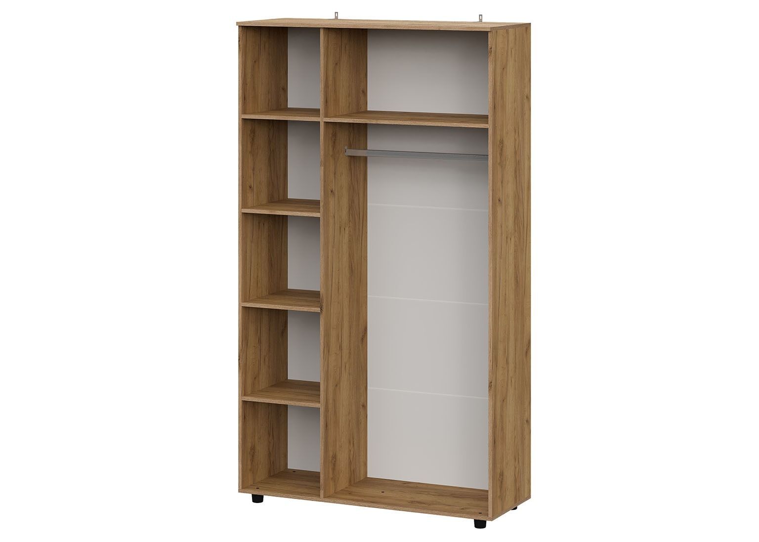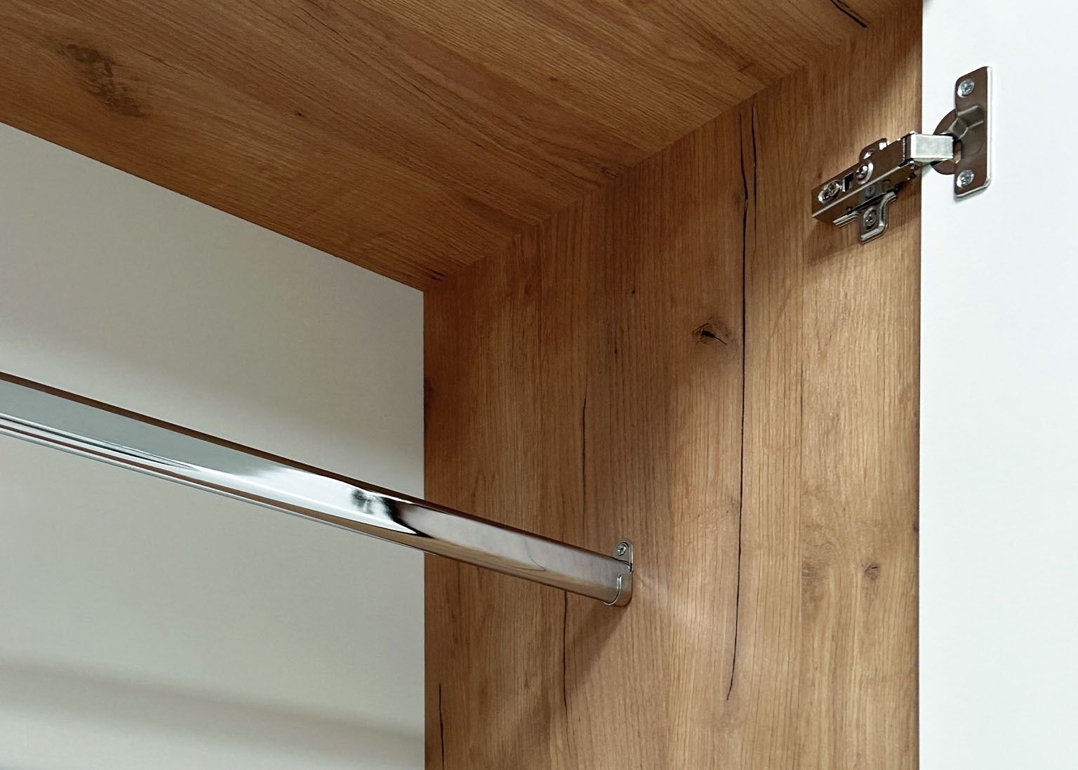 Внутри шкафа расположены полки и отсек со штангой для одежды. Это позволяет удобно разместить все ваши вещи и сэкономить пространство.